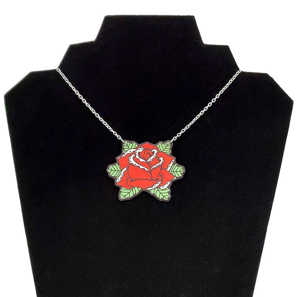 We’re super excited to carry these handmade 40’s & 50’s-inspired designs by UK artist Dolly Cool. This necklace features a beautiful red rockabilly rose with green foliage and a black & white polka dot trim. Charm measures approx. 3 1/4″ wide by 2 1/4″ high, and is attached to an 18″ low-nickel, silver-plated chain. The design is hand drawn and coloured by the artist, then cut and sealed with varnish for protection.