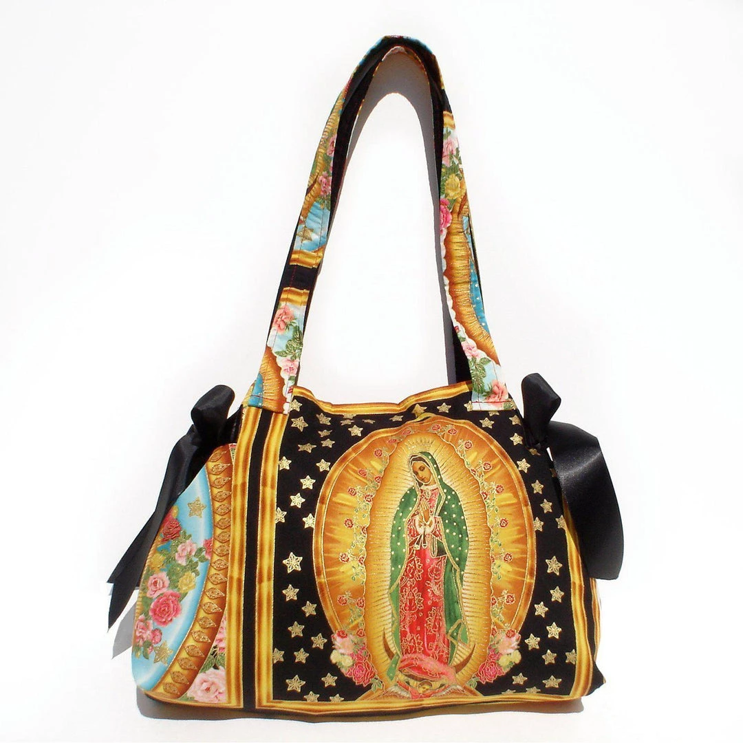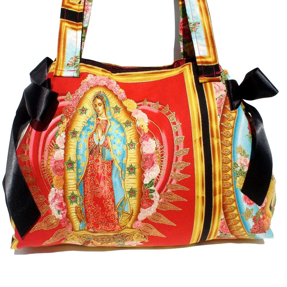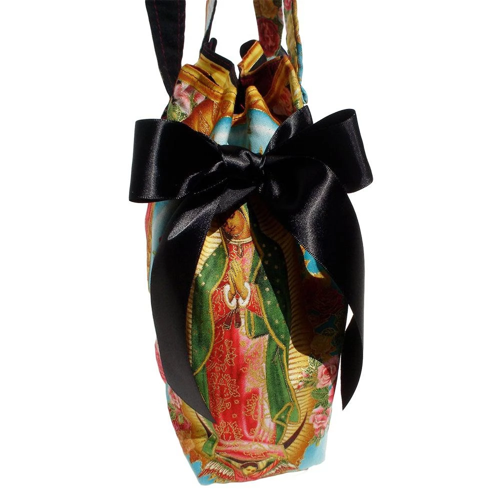 This unique purse from Hemet features vivid art panels of Guadalupe, the Virgin Mary. It is fully lined in a thick red satin-poly fabric and a magnetic closure allows a quick open-close closure. Two permanently attached black satin ribbons on each side can be used to adjust the size of the purse.