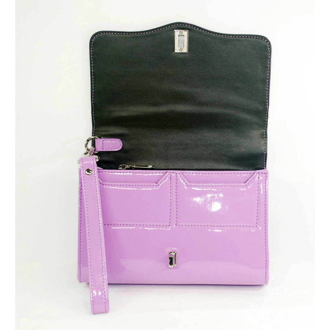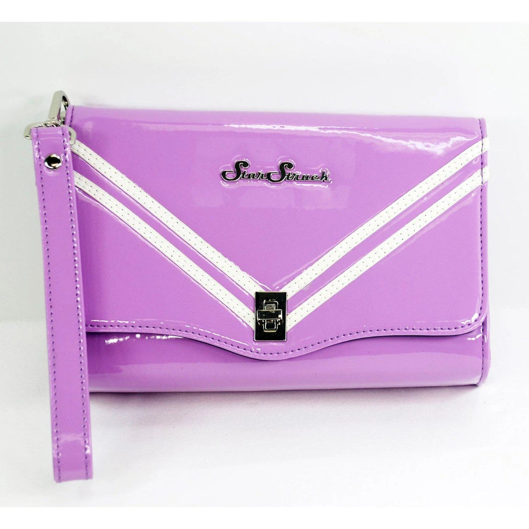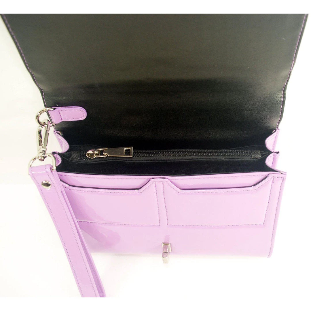 Go straight to the moon with the Star Struck Rocket Clutch! Made from shiny lavender and white vegan friendly vinyl, it is sure to get noticed! The perfect compliment to any outfit, this handbag features a removable wrist strap, a metal front clasp, and 2 built in card holders. Lined with sturdy cotton. A large zipper pocket divides this bag into 2 separate compartments.