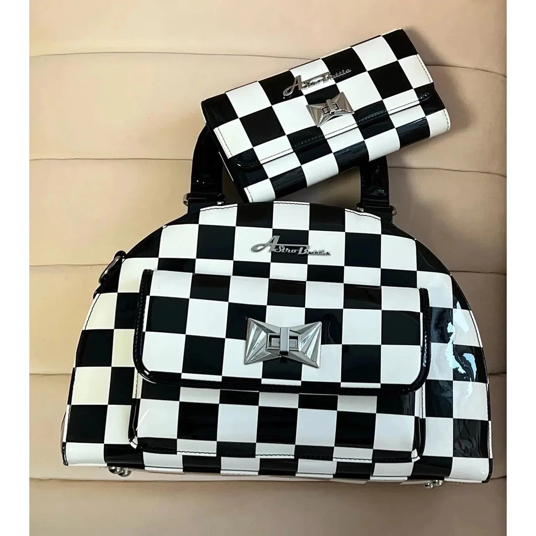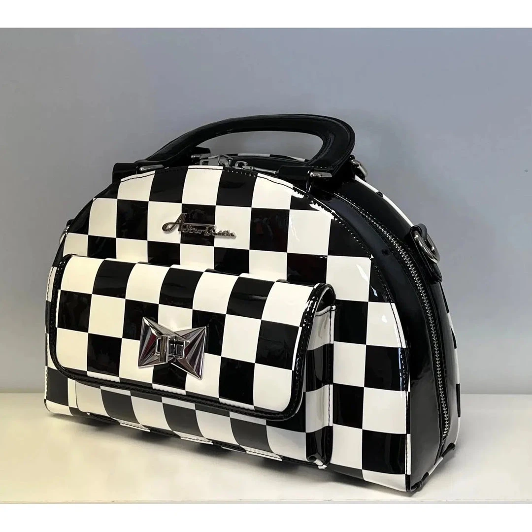 Reach for the stars with our Starlite Bag! Made from Black and White Checkerboard and Shiny Black vinyl, it features Starstruck’s exclusive Art Deco Inspired clasp and new Astro Bettie logo. The bag has grab-and-go handles and a 50″ adjustable strap to wear over the shoulder or crossbody. The interior includes a zipper pocket, cell phone pocket and is lined with sturdy cotton.