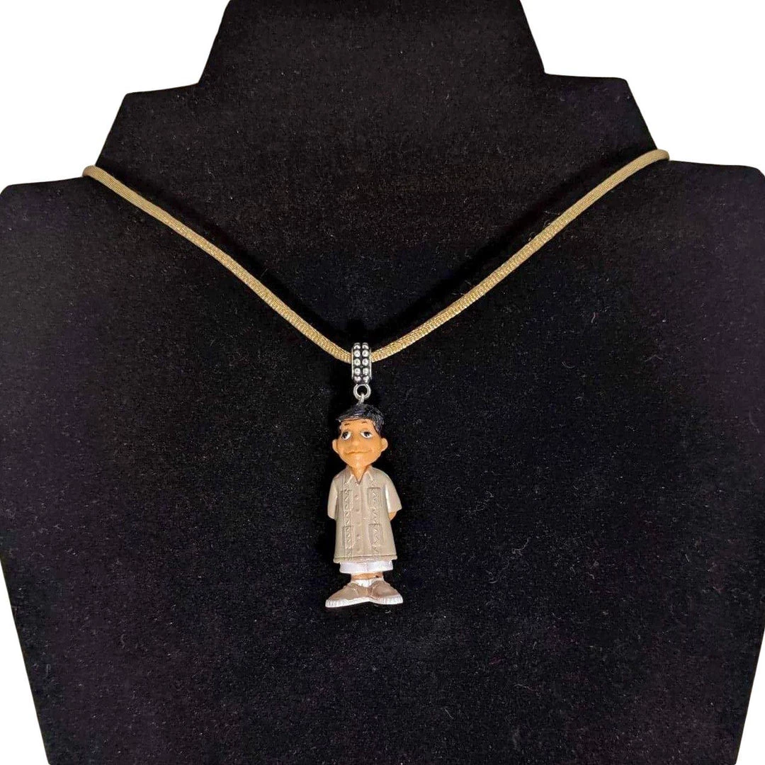 A super awesome necklace from Santa Fe artist Maria Delgado-Rooks! This necklace features Homie-Mijos Enrique hanging from a coffee-colored satin cord. The necklace measures 30″ around and is adjustable.Â
