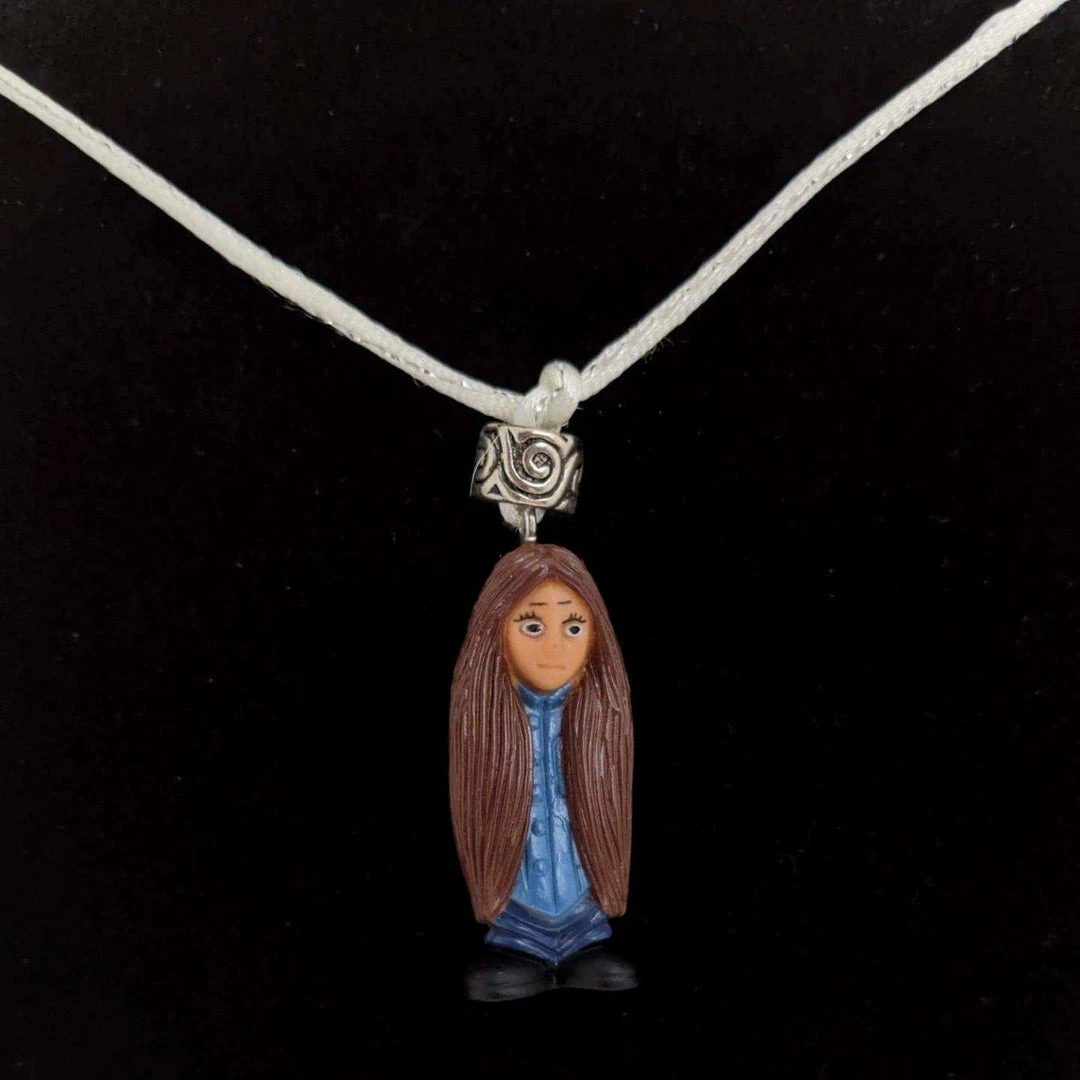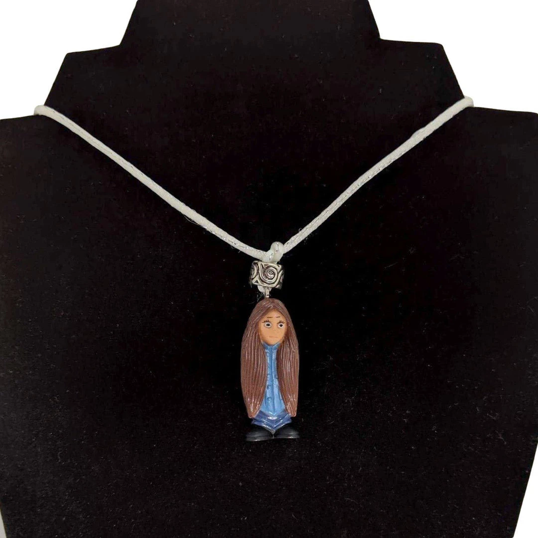 A super cute necklace from Santa Fe artist Maria Delgado-Rooks! This necklace features Homie-Mijos Monica hanging from a white and silver satin cord. The necklace measures 26″ around and is adjustable.Â