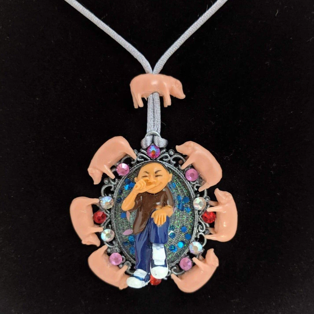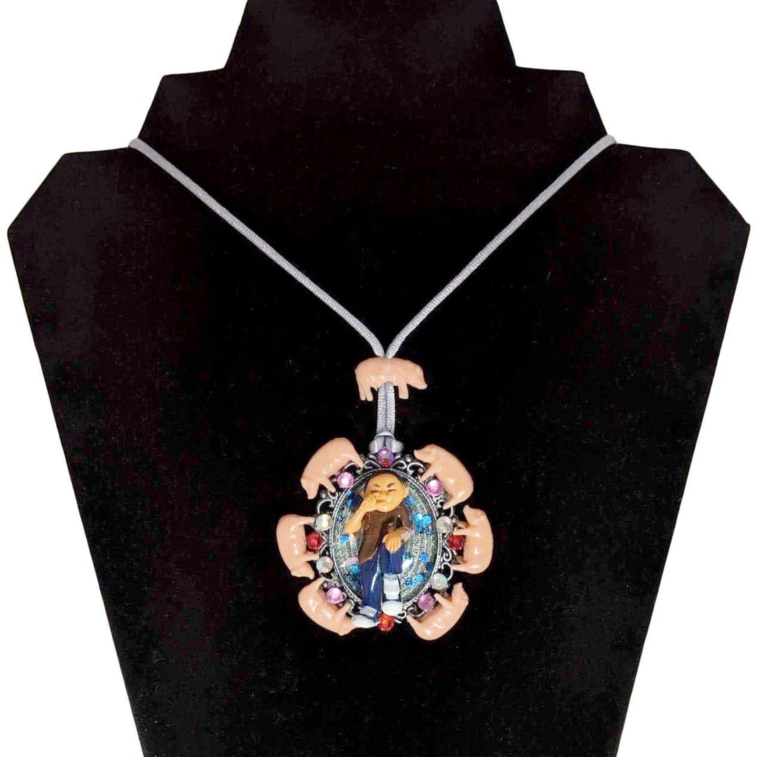 A super fun necklace from Santa Fe artist Maria Delgado-Rooks! This necklace features Homie-Mijos Perrodo inset on a pendant. Around him are red, pink, and white gemstone and pigs. The pendant hangs from a gray satin cord that measures 26″ around and has an easy to use bar and ring clasp.