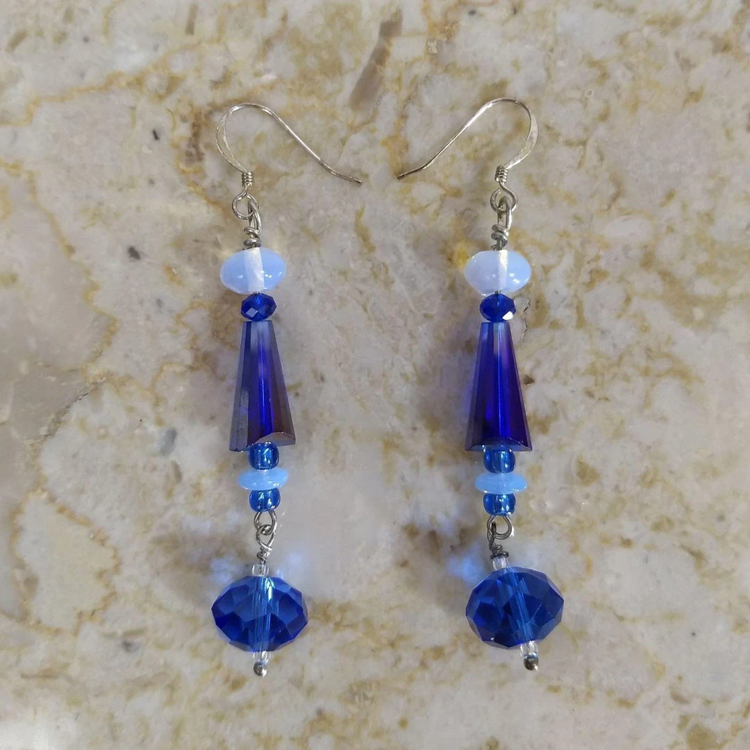 These beautiful blue earrings were crafted by Santa Fe artist Maria Delgado-Rooks! These feature a white bead with varying blue beads following after. The earrings are made out of Czechoslovakian beads and measure 2.5″ from the wire to the bottom of the earring.Â
