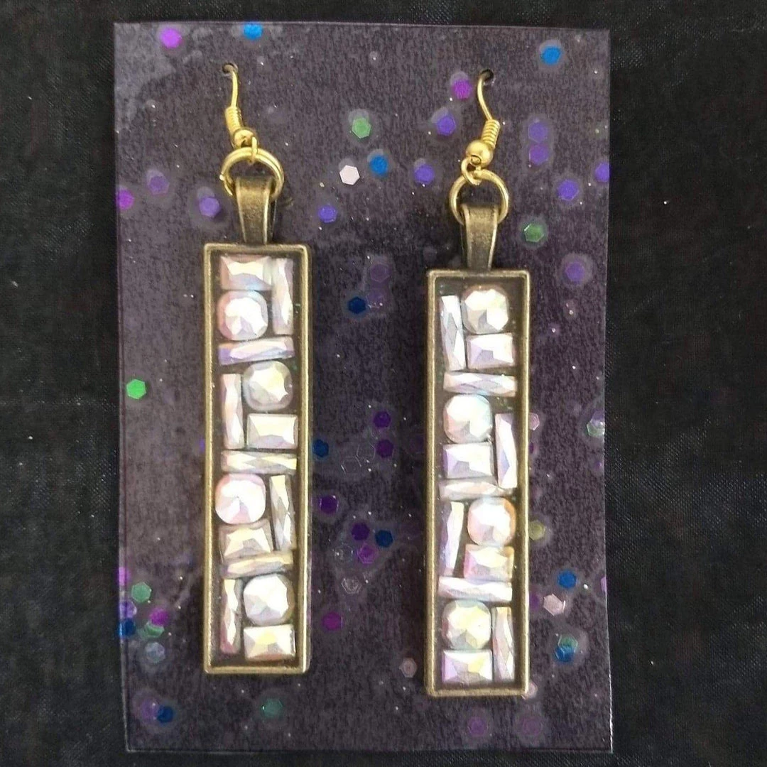 A creative pair of earrings from Santa Fe artist Maria Delgado-Rooks! These earrings are bronze and have white stones inlaid on a clear glitter background. The earrings dangle 3″ down and are lightweight. These earrings can help any outfit come alive!