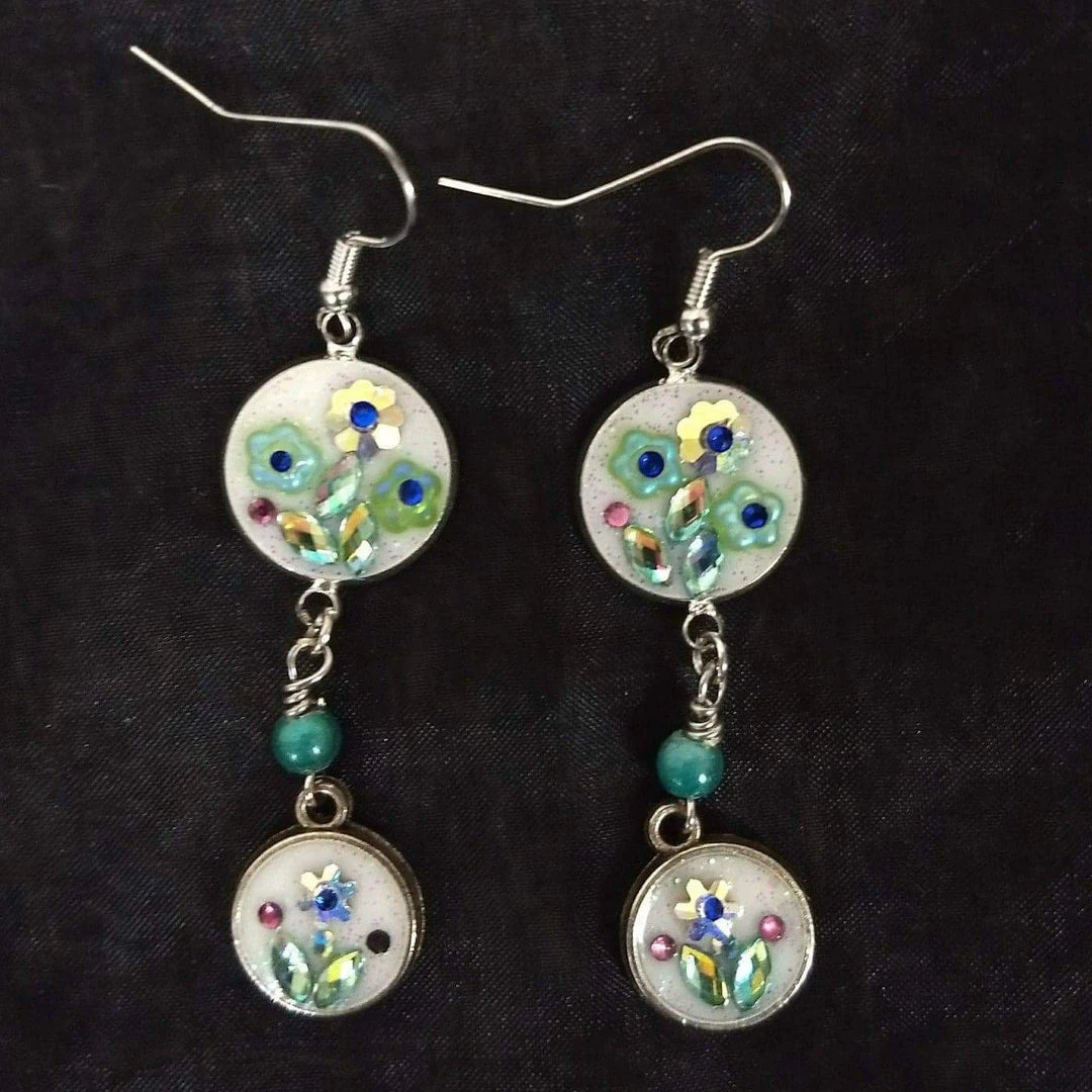 A great pair of earrings from Santa Fe artist Maria Delgado-Rooks! These earrings feature two circular pendants and a baby blue bead hanging between them. The large pendant has three flowers and the smaller pendant has a single crystal flower. The earrings are silver in color and hang 2.5″ down.