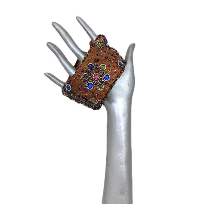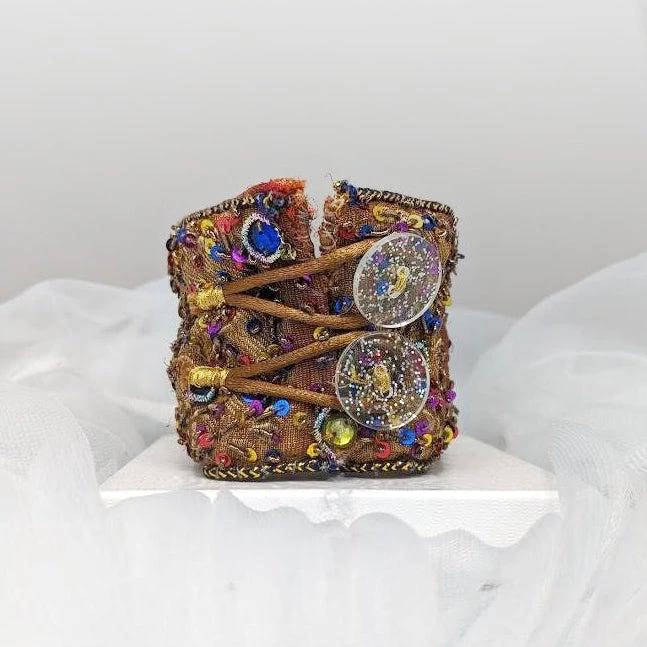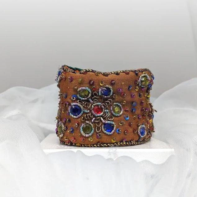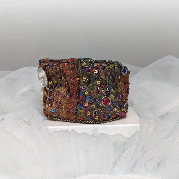This bracelet is the desert jewel of accessories! It was handmade by Santa Fe artist Maria Delgado-Rooks! This bracelet is deep tan, green, and orange. All around the bracelet different colored sequins and jewels are sewn in. The bracelet closes in the back with 2 clear, sparkly buttons.Â