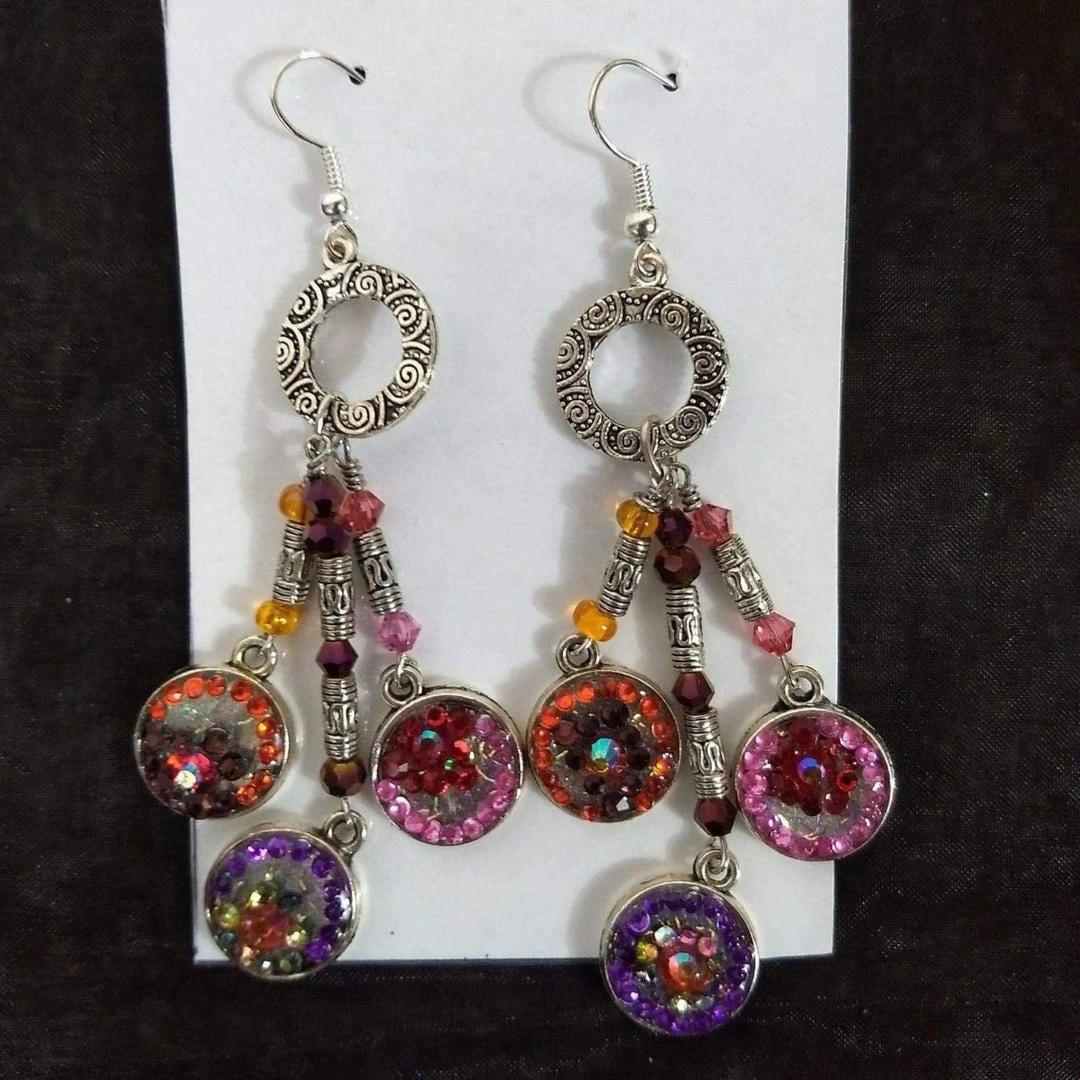 A beautiful pair of earrings from Santa Fe artist Maria Delgado-Rooks! These unique earrings feature pink, purple, and orange gems. At the top, a silver ring hangs, dangling below are silver bars with gems. At the end of the earrings are silver rounds with gems inset in them. Each earring features three silver bars of varying length with rounds at the end of each. The earrings hang 3″ down.