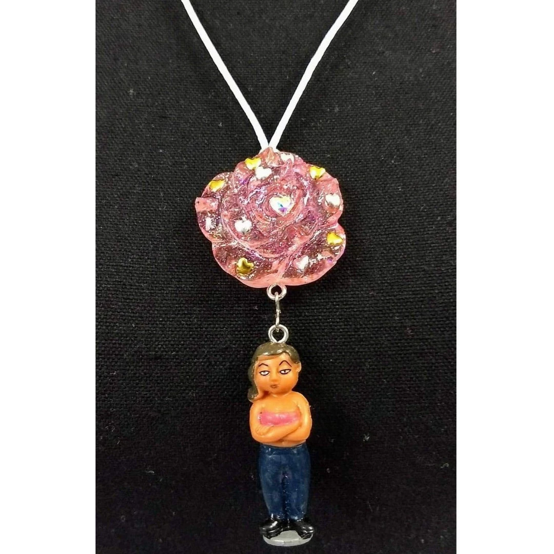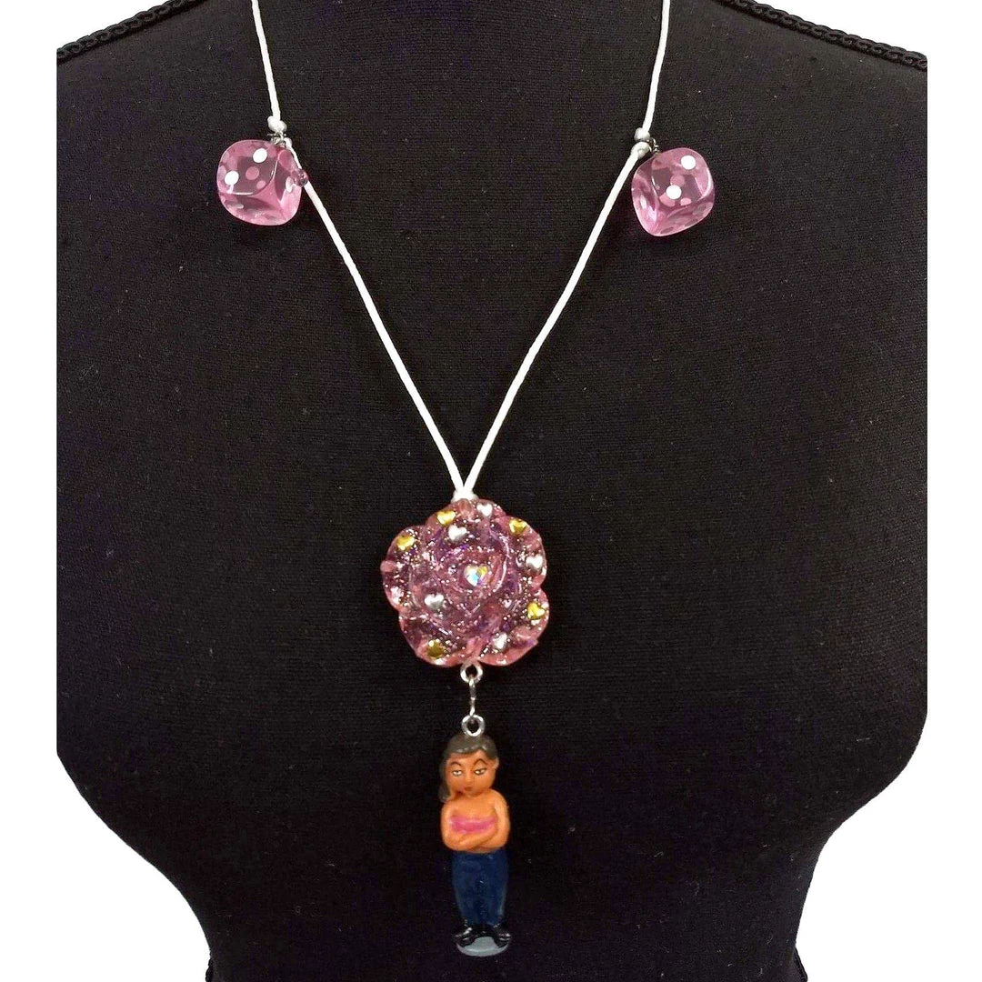 Get yourself some Homies fun with this beautiful necklace! It features the lovely Rosa Homie figurine hanging from a white satin cord embellished with two pink dice and a pink glitter rose with gold and silver hearts. The necklace is 27″ around and features a bar and ring clasp.Â