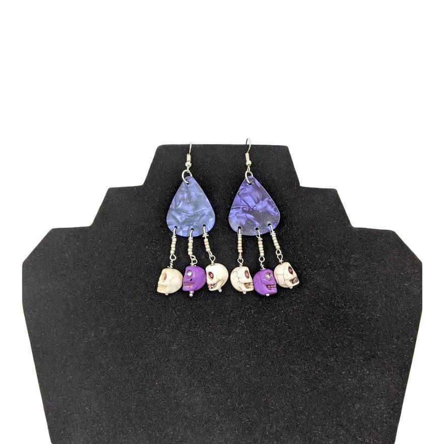 These are some rocking earrings from Santa Fe artist Maria Delgado-Rooks! These fantastic earrings feature a purple guitar pick with small white beads and three skulls hanging from it. There are two white skulls with a purple skull hanging in the middle. These earrings dangle 2.5″ from the ear.