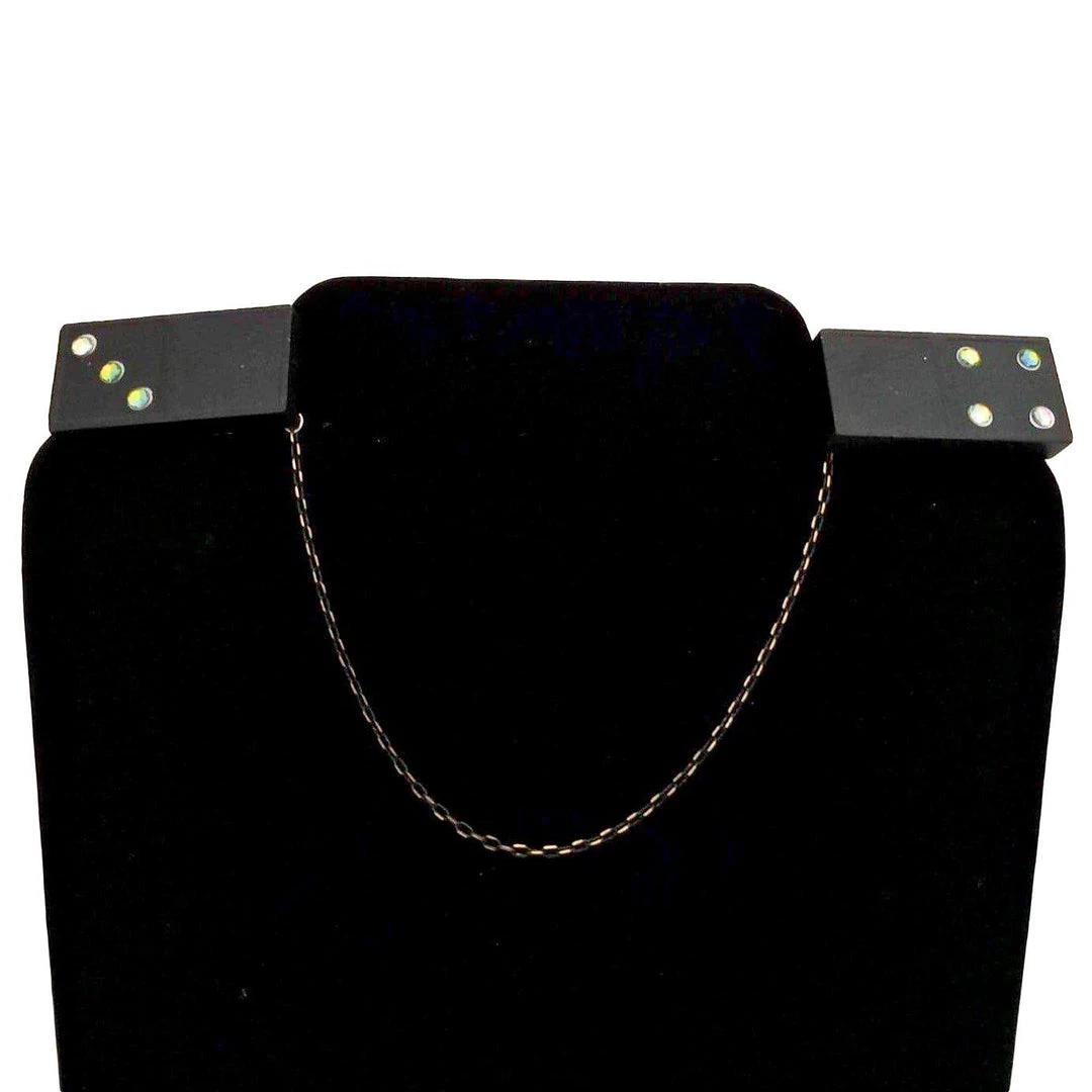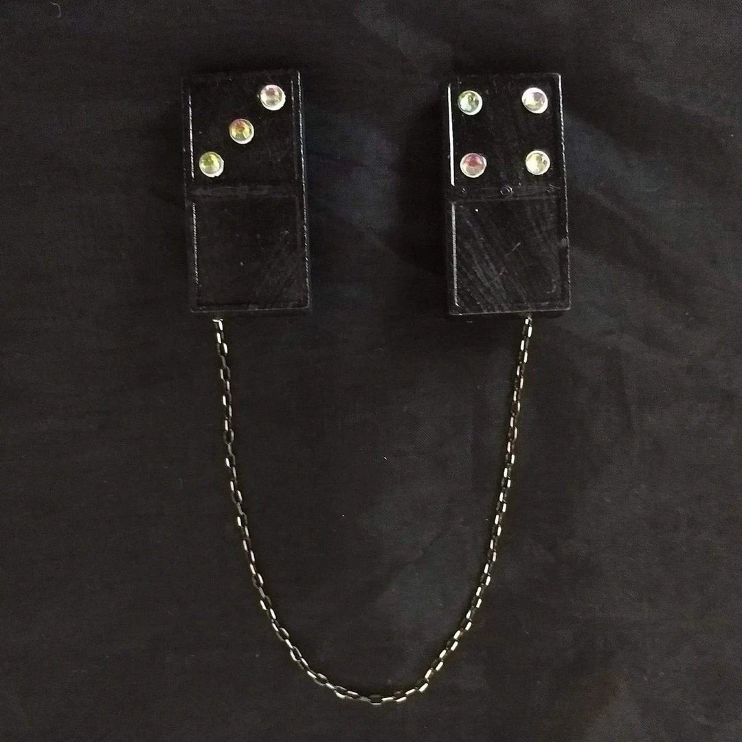 This fanciful sweater clip is an original handmade piece that features black dominoes with multicolored rhinestone dots on each domino. The sweater clip has a bronze colored chain that measures 8.5″ across and has easy to use clips on the back of each domino. Perfect for turning a simple cardigan into a statement piece!