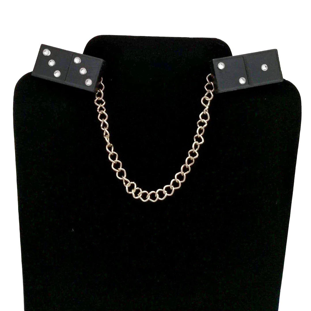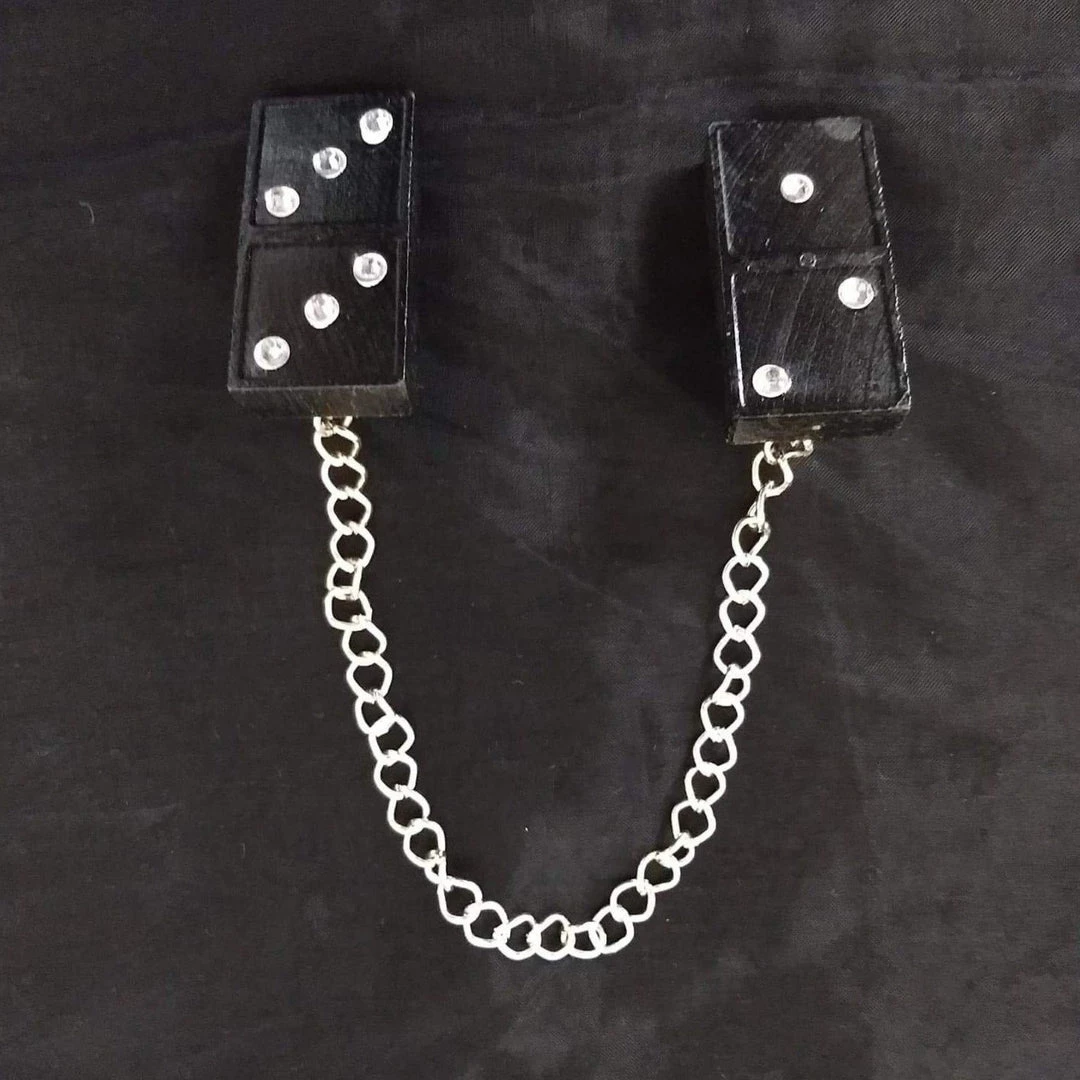 This fanciful sweater clip is an original handmade piece that features black dominoes with silver rhinestone dots on each domino. The sweater clip has a silver colored chain that measures 8″ across and has easy to use clips on the back of each domino. Perfect for turning a simple cardigan into a statement piece!