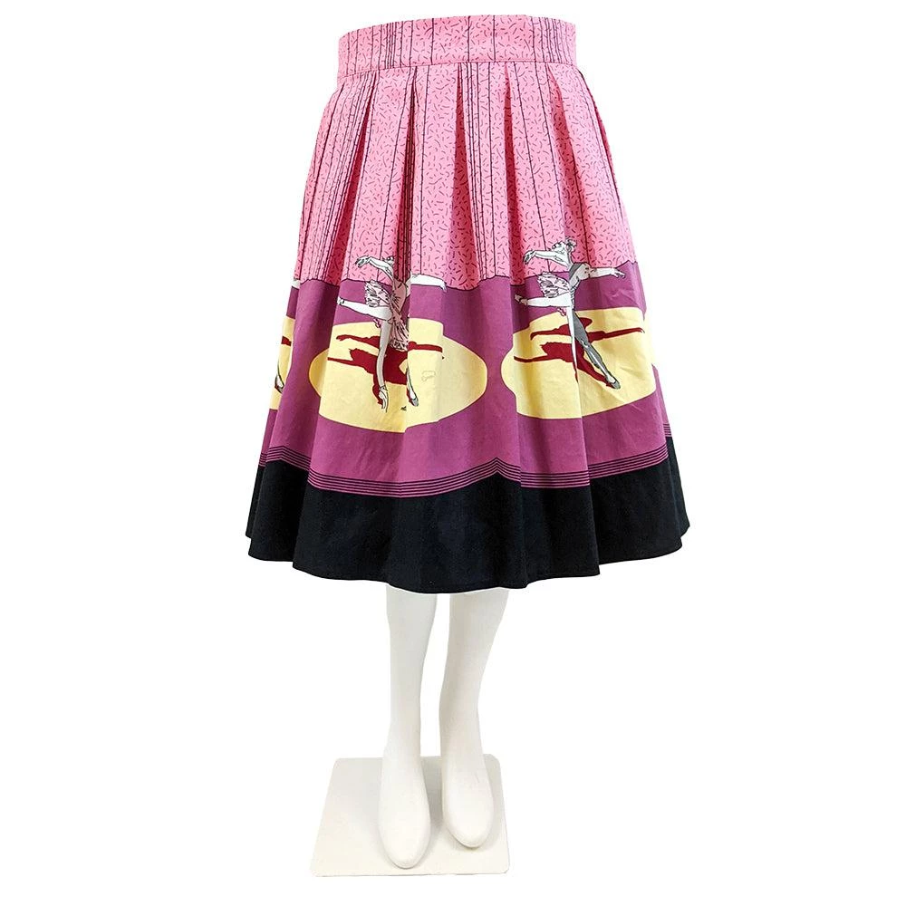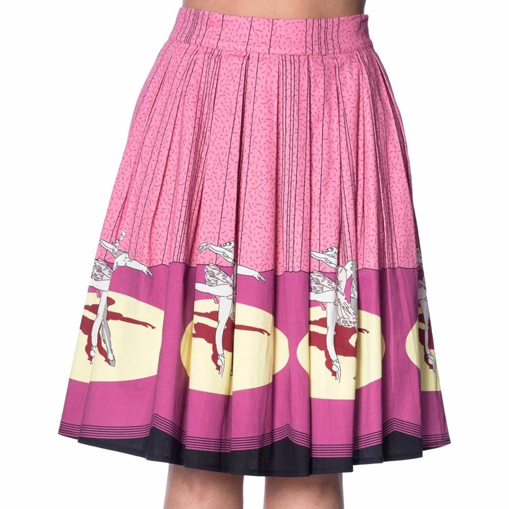 Be pretty in pink with this lovely swing skirt featuring original ballet-inspired artwork from Banned. The hand-drawn design of a ballet duet on center stage sits on a magenta background below a pink curtain. The floaty full skirt swings elegantly as you walk, as elegant as the design itself. High-waisted cut, rear center zip.Â