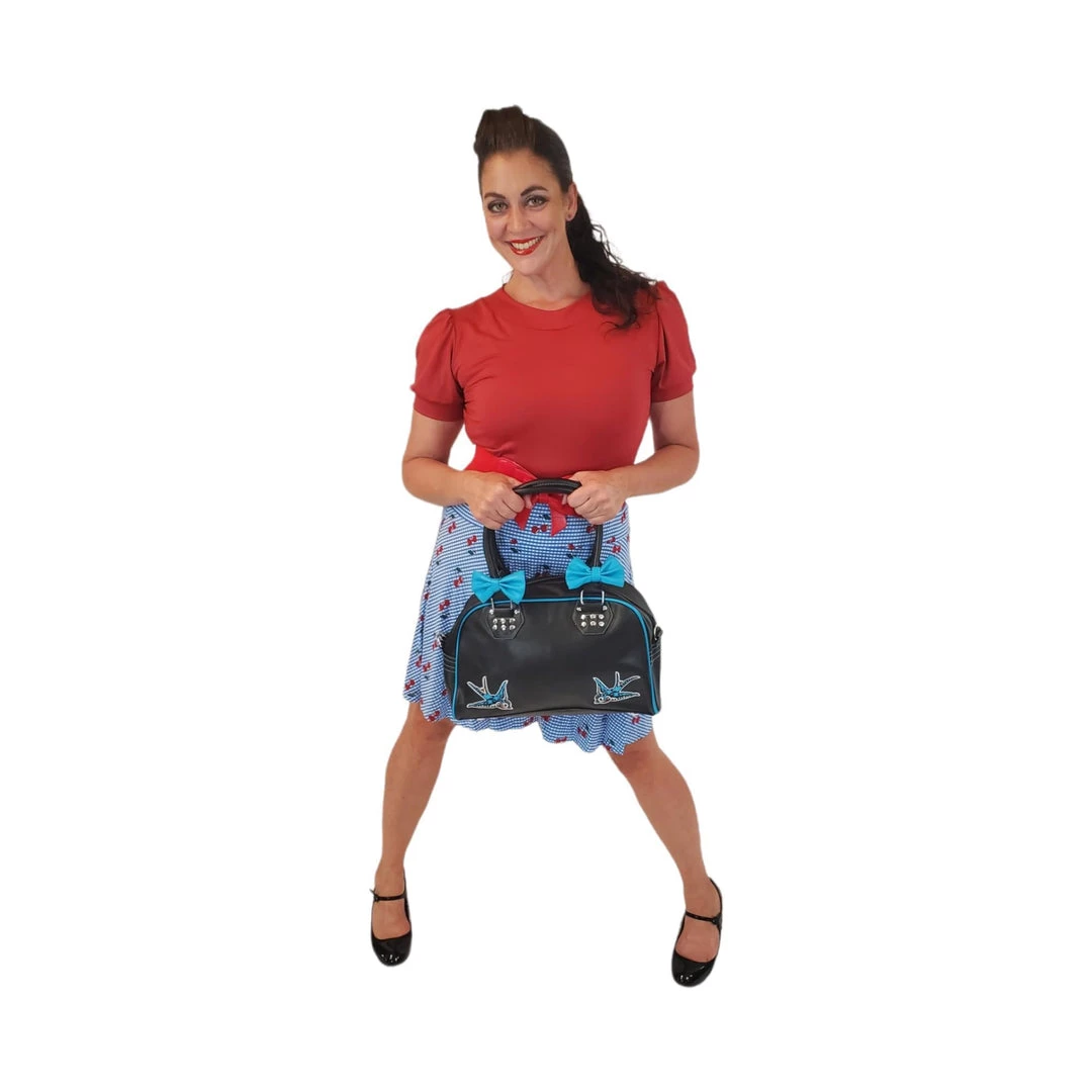 Banned Apparel brings you another stylish and practical handbag in the Blue Swallows purse. Styled with a robust black handle, it has beautiful turquoise blue swallows and bows on the front of the bag and an extra-handy zip closure pocket at the back. This bag has an adjustable and removable faux leather shoulder strap, a zip opening across the top, and inside there are several inner pocket pen holders and a secure pocket that closes with another zip. Measures 14″ wide, 5″ deep, 9″ tall.