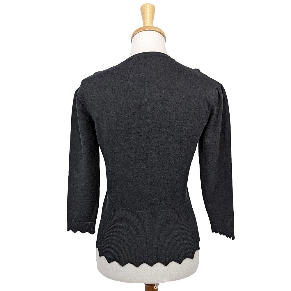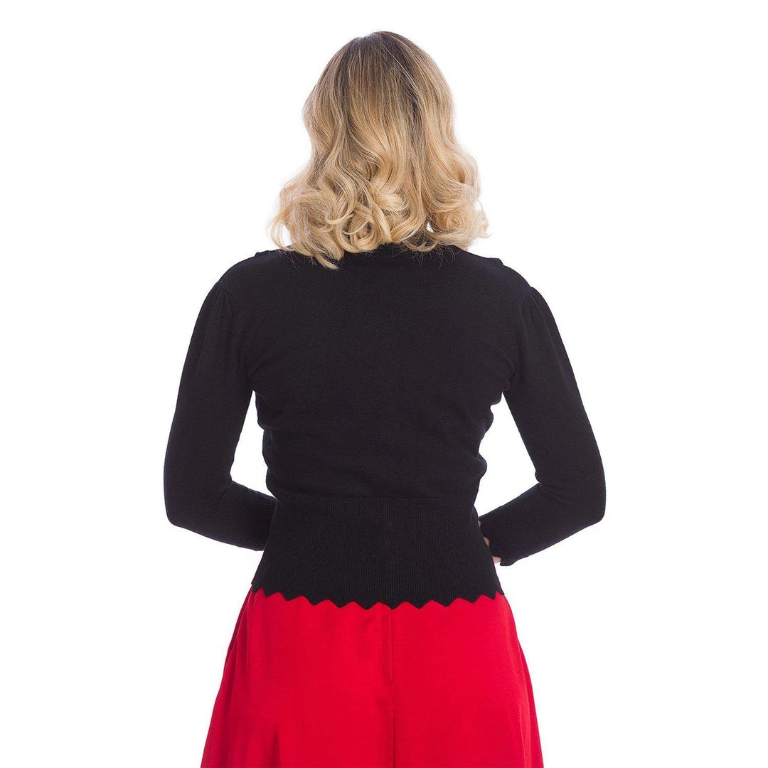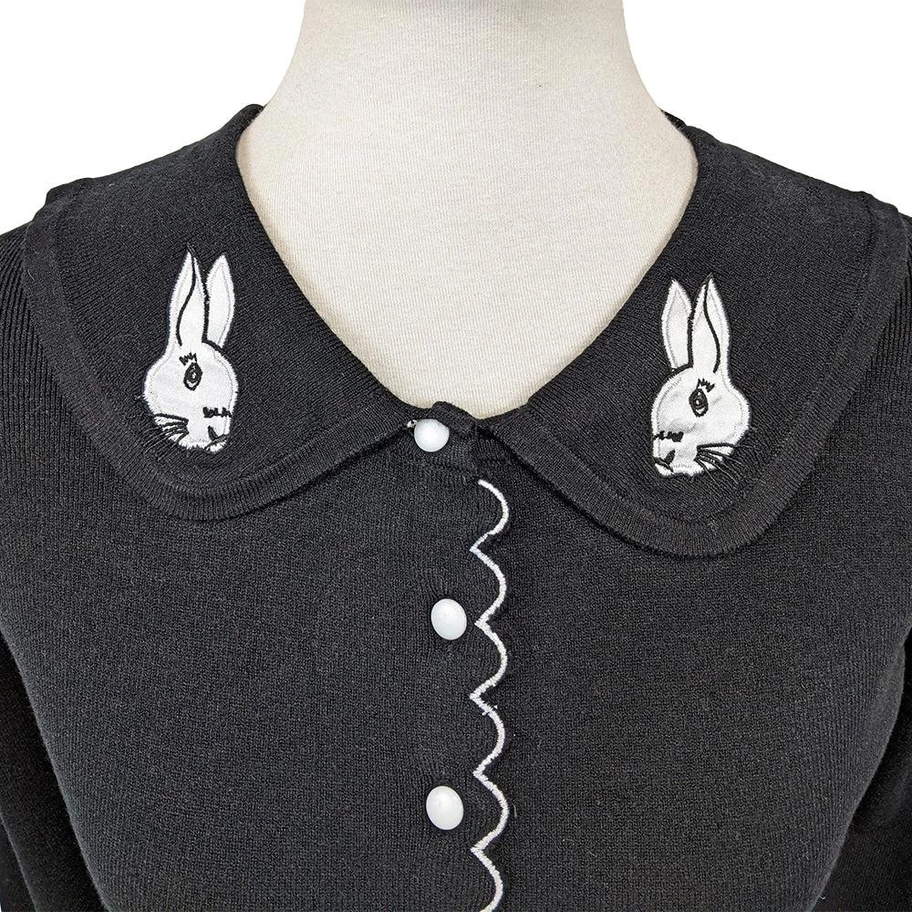 Let’s hop to it! The most adorable bunnies snugly peep out of each lapel of the rounded collar which adds to the fabulous proportions of this cardigan which are further enhanced by the white center button fastenings. The peplum hem is trimmed with a scalloped edge that adds to the vintage inspiration of this timeless classic.