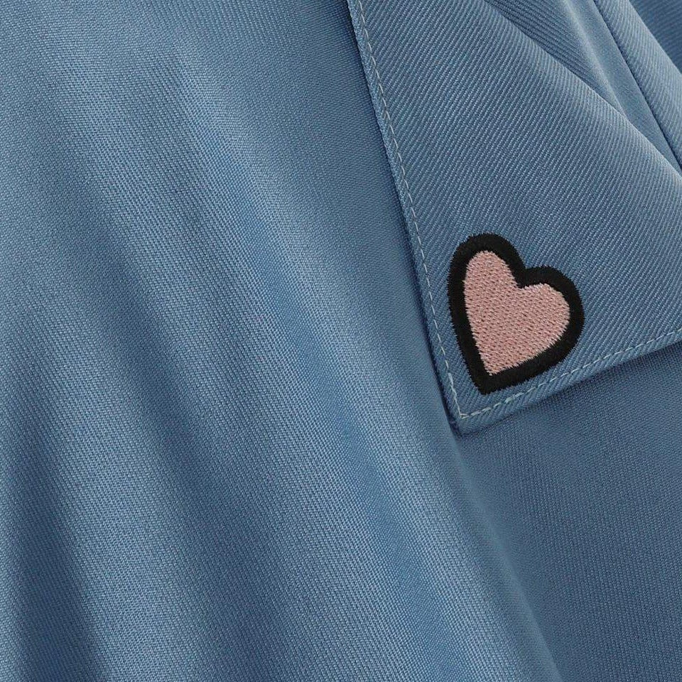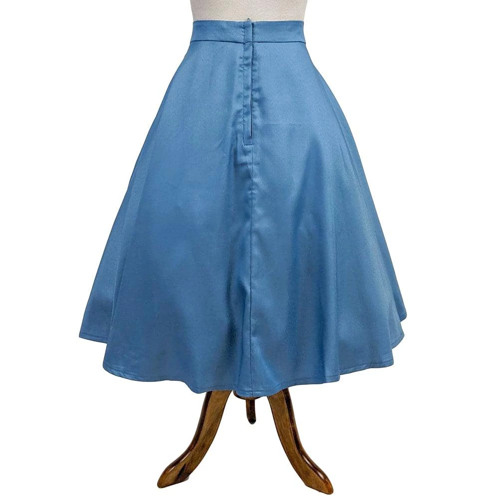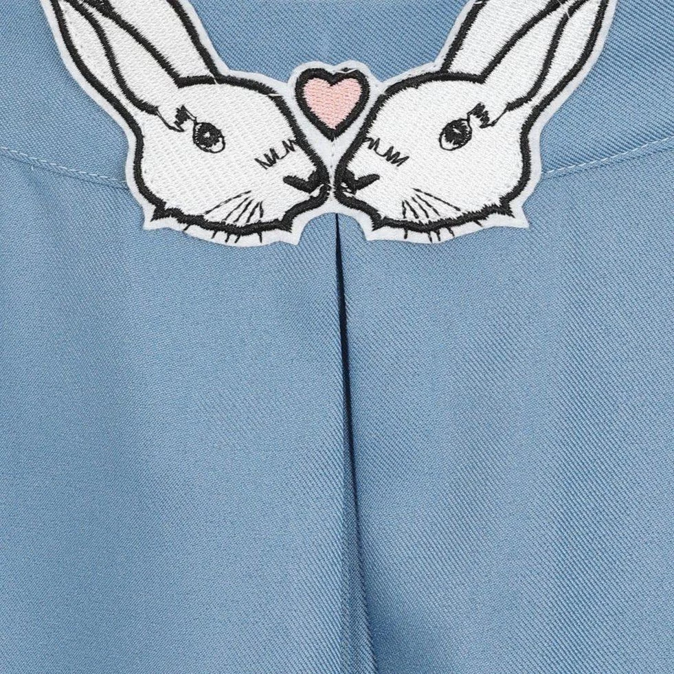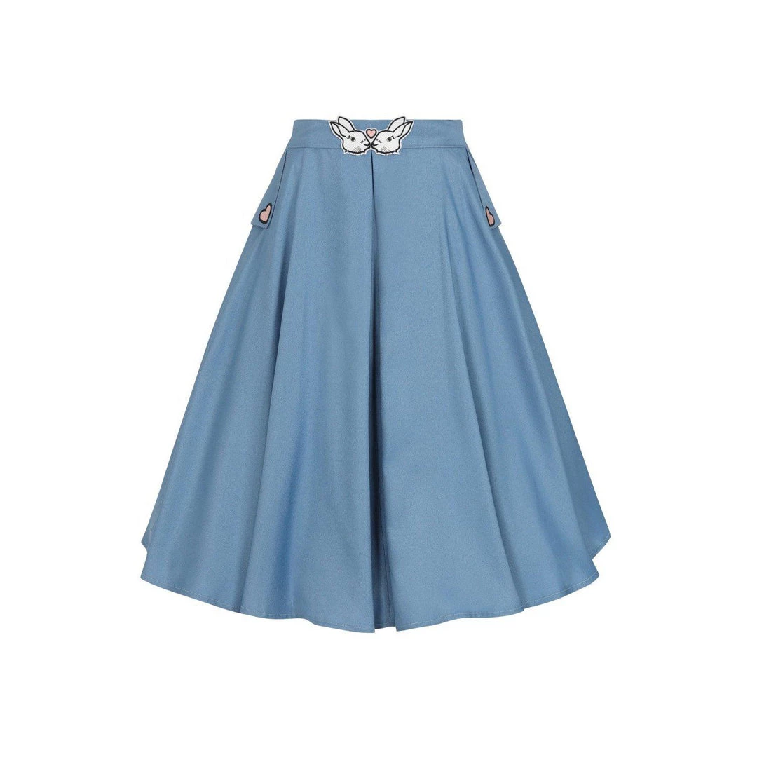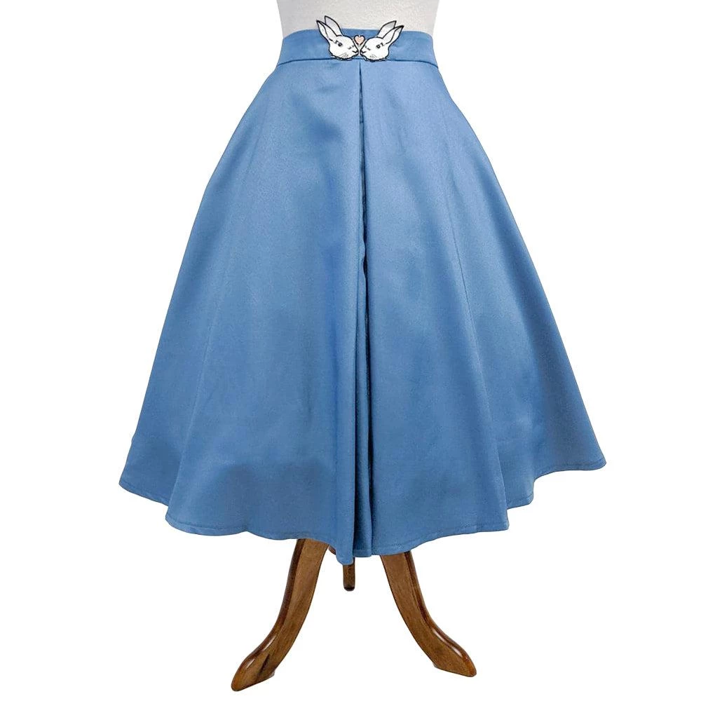 This skirt will remind you that you are some-bunny special! Made out of beautiful blue material, this flared skirt features two kissing bunnies on the waist and adorable embroidered hearts on the pockets. There is a hidden zipper and button closure in the back.Â