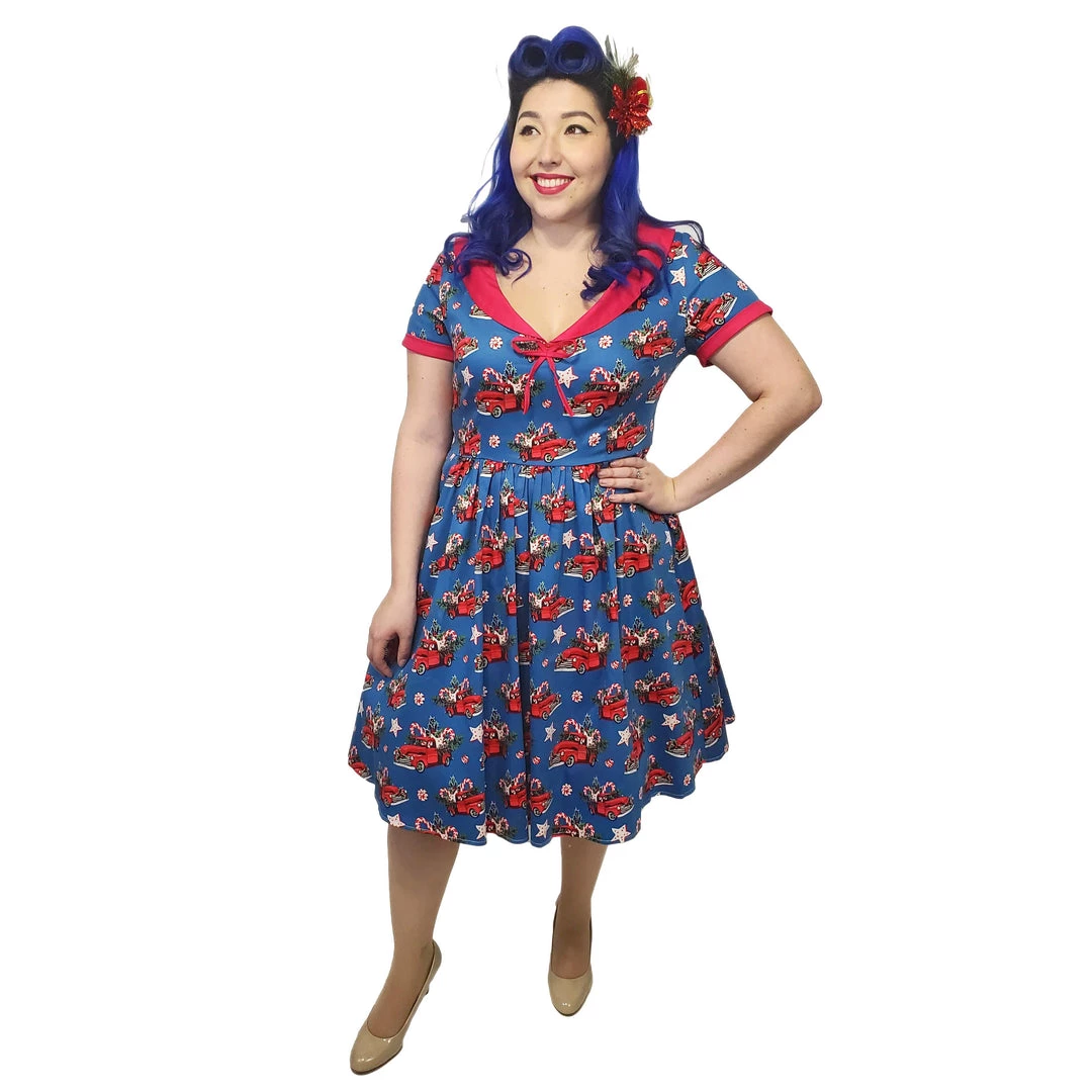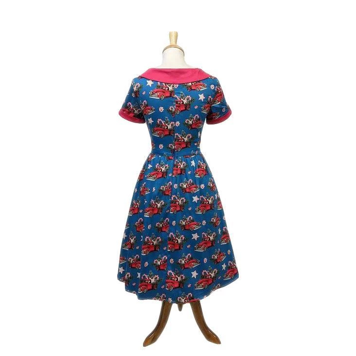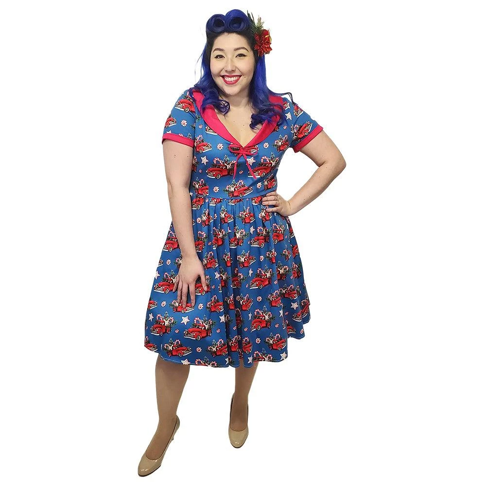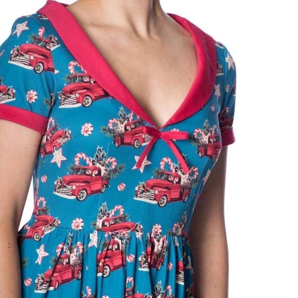 Celebrate the holidays in this sassy swing dress from Banned. It features a fabulously fun print of peppermint candies and Santa’s sleigh as a vintage red pickup truck, all on a blue background. The dress has short sleeves, a super flattering V-neck, a nipped-in waist, and a full skirt. The sailor-style collar and sleeve cuffs are a bright and festive red. It has side seam pockets and zips up the back.