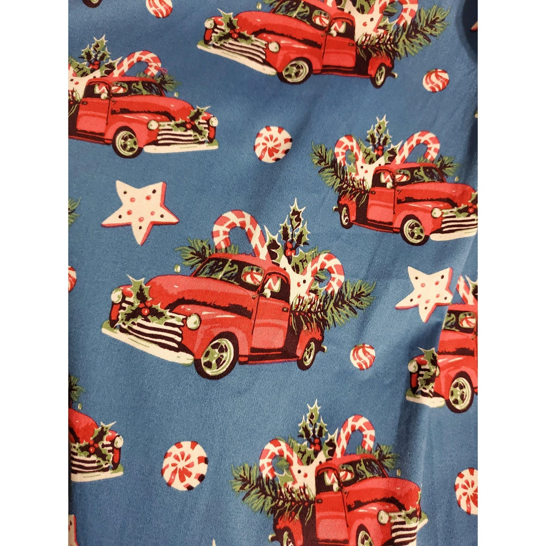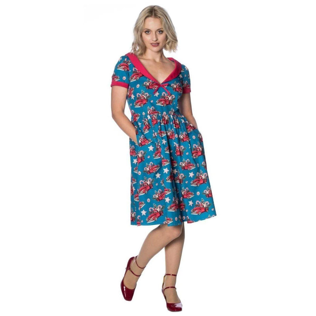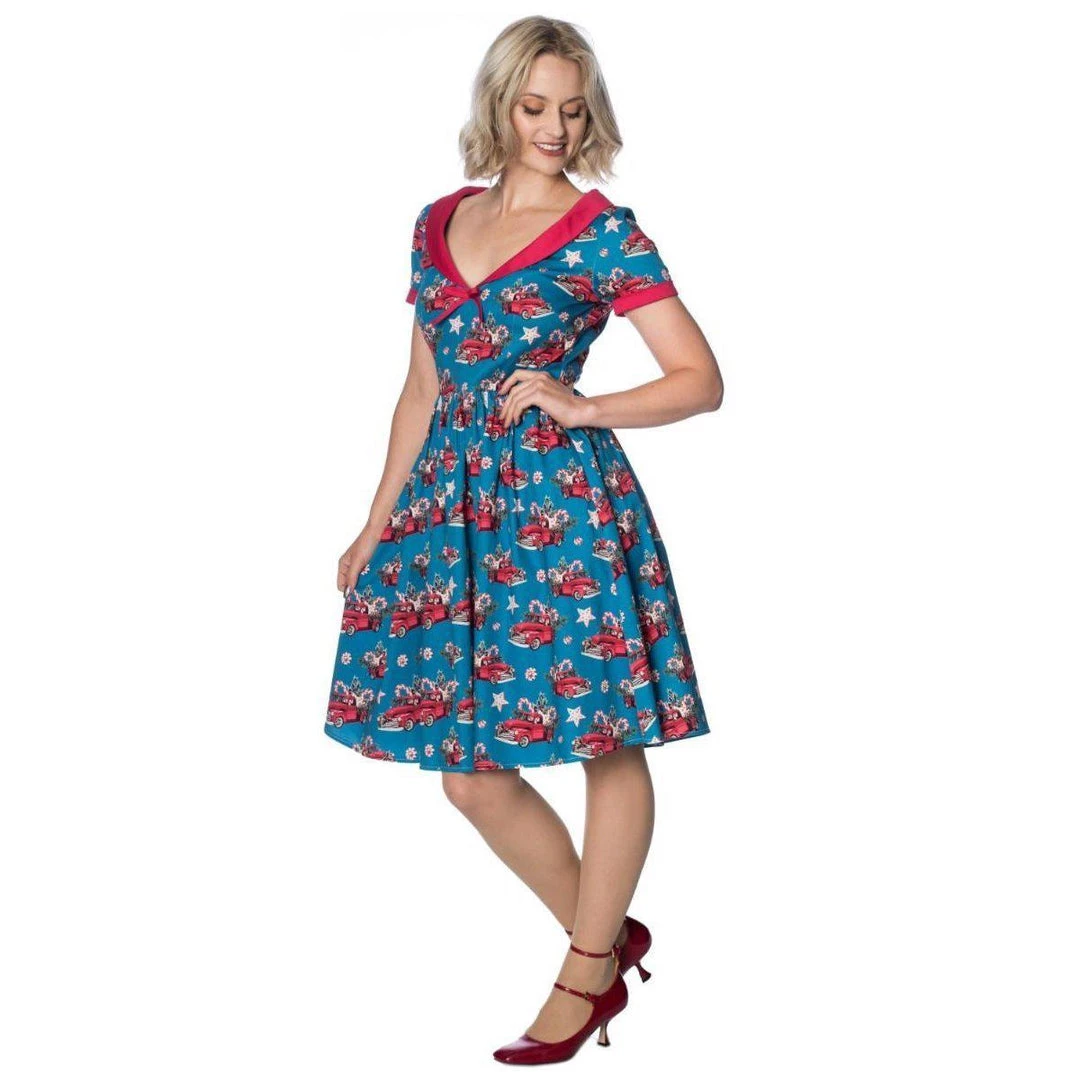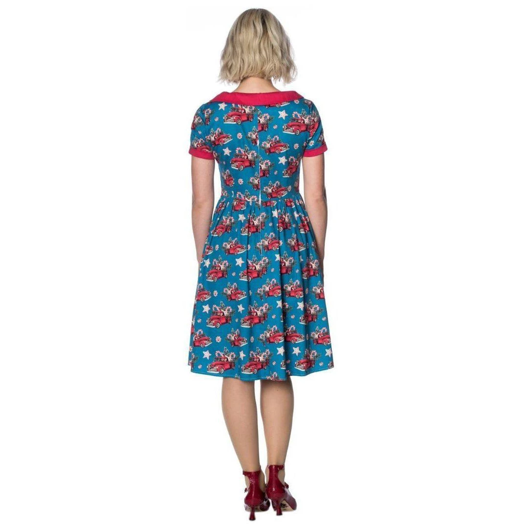 Celebrate the holidays in this sassy swing dress from Banned. It features a fabulously fun print of peppermint candies and Santa’s sleigh as a vintage red pickup truck, all on a blue background. The dress has short sleeves, a super flattering V-neck, a nipped-in waist, and a full skirt. The sailor-style collar and sleeve cuffs are a bright and festive red. It has side seam pockets and zips up the back.