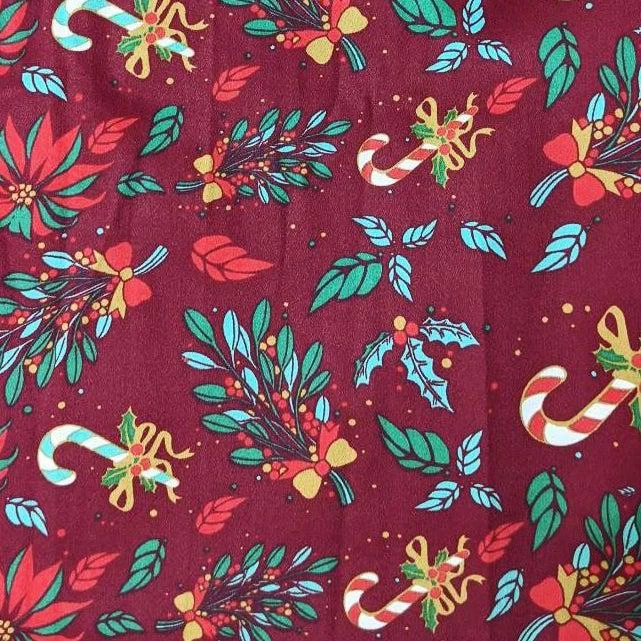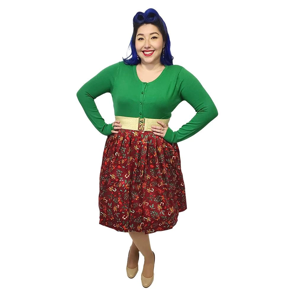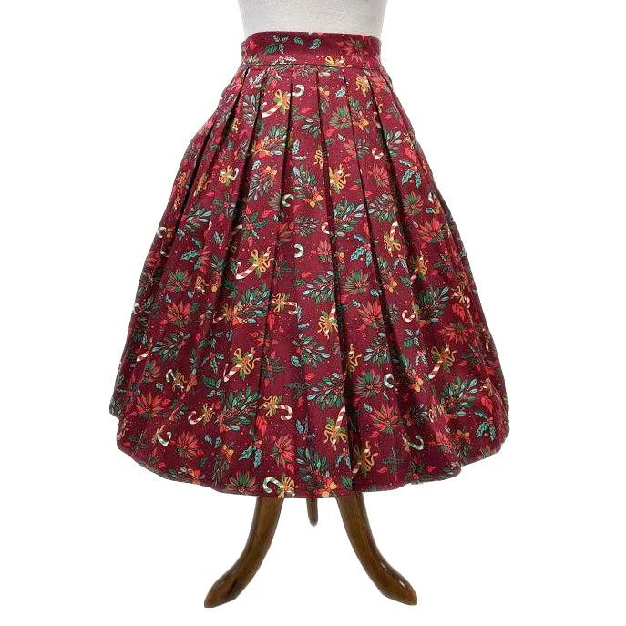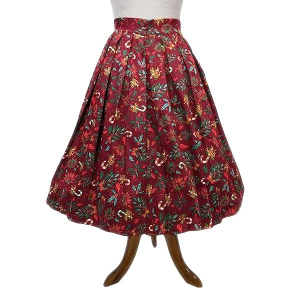 Candy canes, mistletoe, and poinsettias help show off your holiday spirit with this Christmas skirt! There are box pleats to give this knee-length skirt a tiered look. A hidden zipper and clasp can be found in the back.