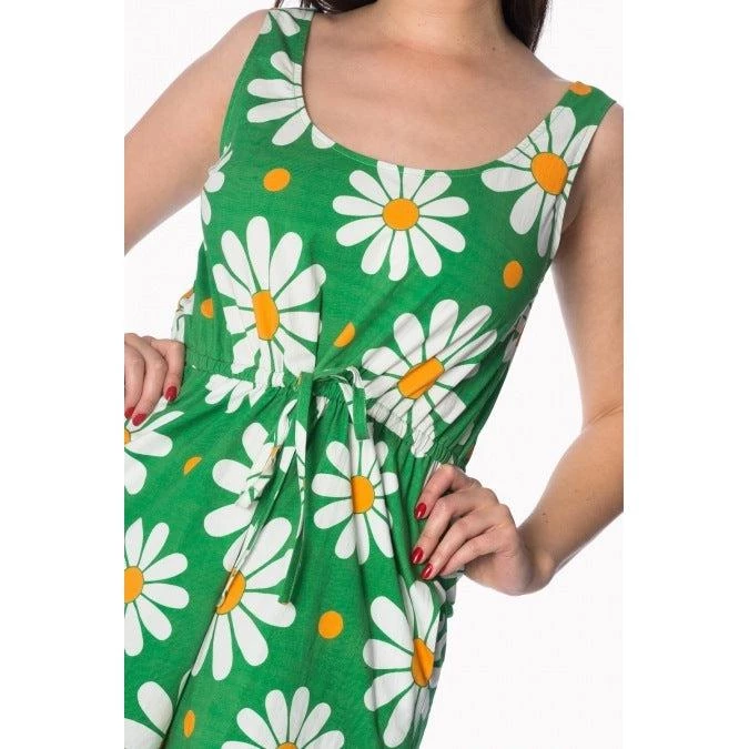 This playsuit from Banned is perfect for those crazy, lazy days of summer! Featuring bright daisies printed on a solid grass-green background, the one-piece garment is sleeveless with a scoop neckline, dipped low in the back, and a drawstring waist tied in front. Front pockets make it so easy and fun to wear!