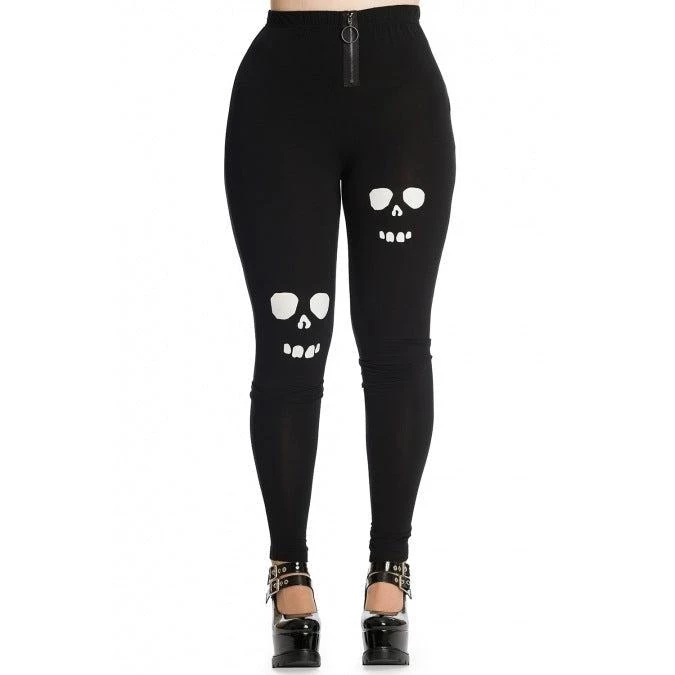 More super fun leggings from Banned, the Dead Souls leggings have creepy faces in white on the front. They have lots of glorious stretch and a short front zipper with a ring pull. Very comfy, indeed!