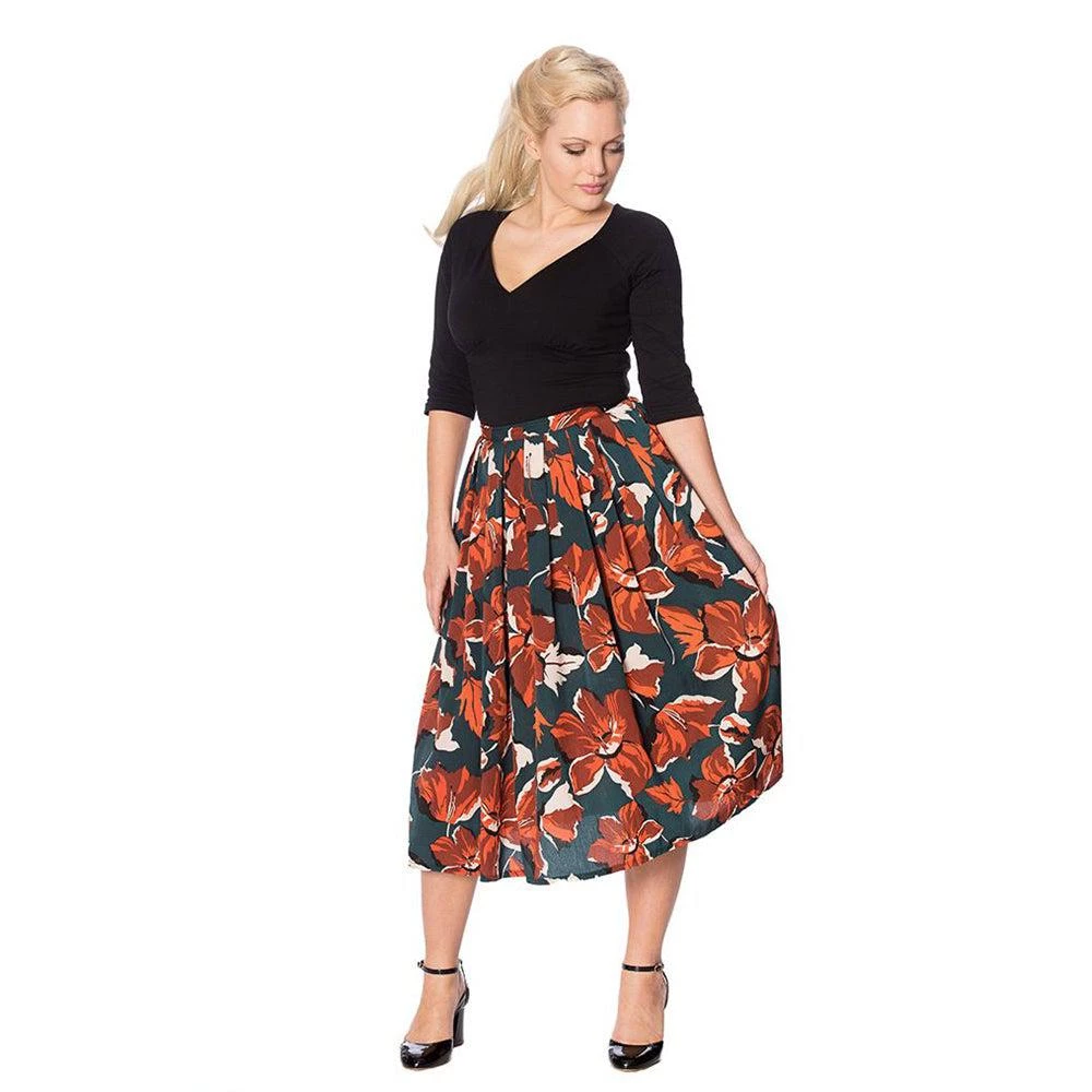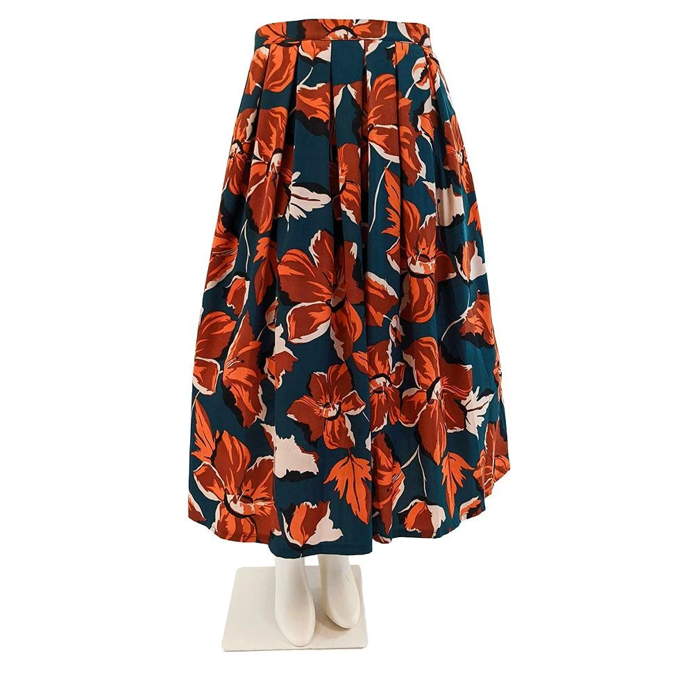 This full, pleated skirt features a lovely orange floral print on a dark teal background. It lands gracefully just below the knee, and closes with a rear center zip.