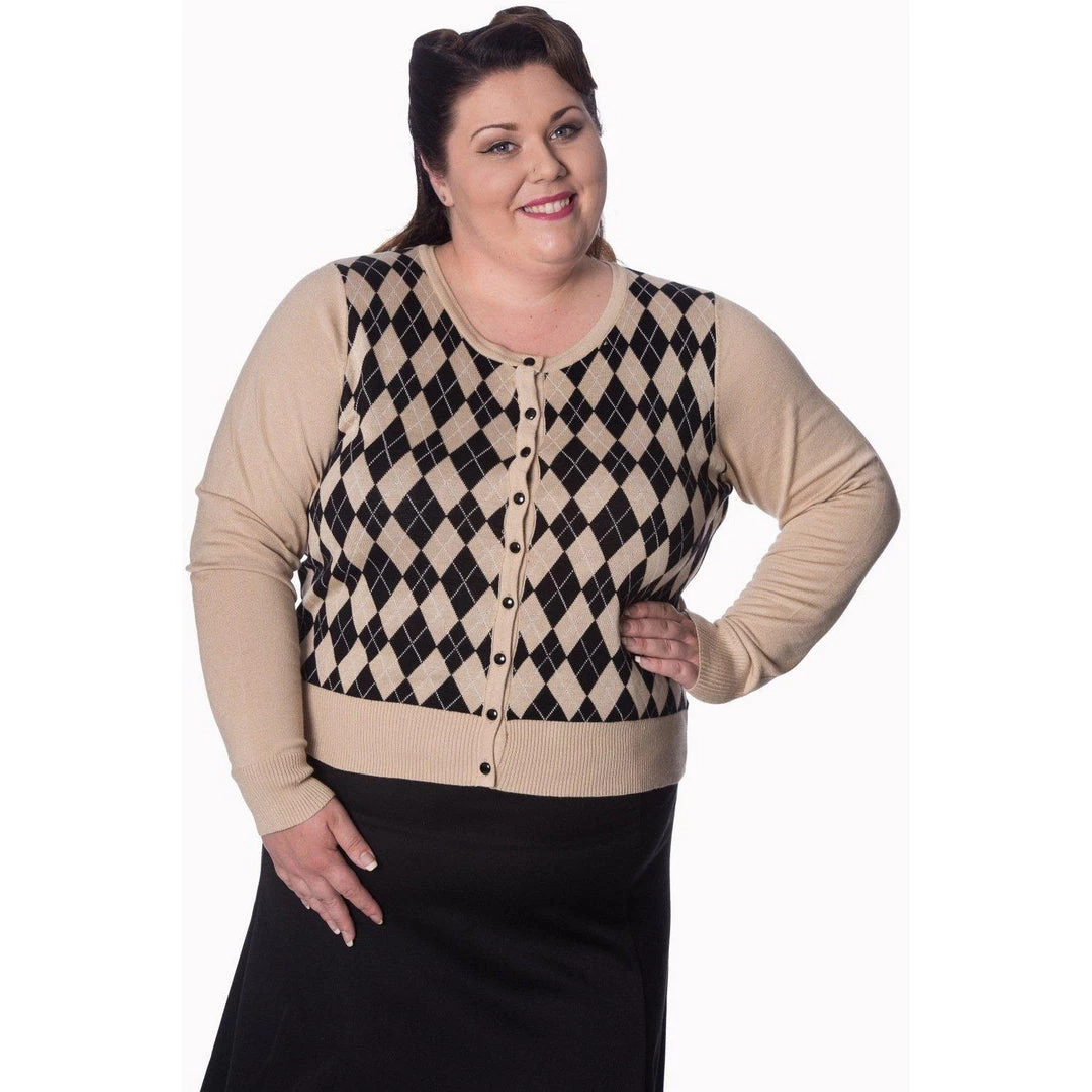 This wonderfully retro cardigan from Banned seems to have walked off a 50’s college campus and right into your heart, because there’s nothing as dreamy as a snuggly argyle sweater! The sweater features a tan and black argyle diamond pattern front and back, with tan sleeves, hem and neckline. The cuffs, hem and neck are ribbed, and it buttons up the front with shiny black buttons.
