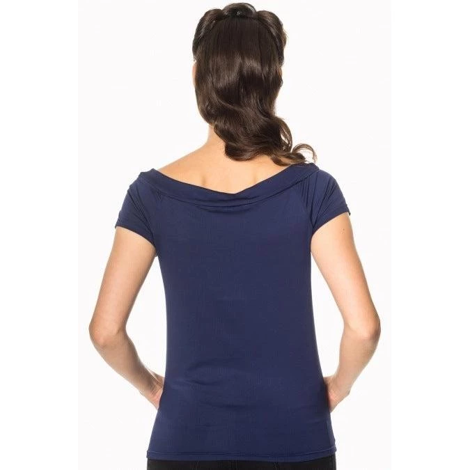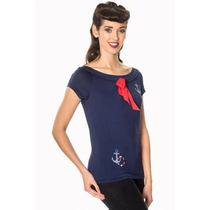 This nautically-themed top from Banned is sure to be a closet favorite! It features a boat neck and short sleeves. The navy blue jersey knit fabric is accented on the front with a sweet red bow in the front and two appliqued anchors. Perfect for any fun in the sun you have planned!