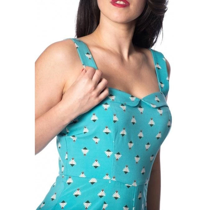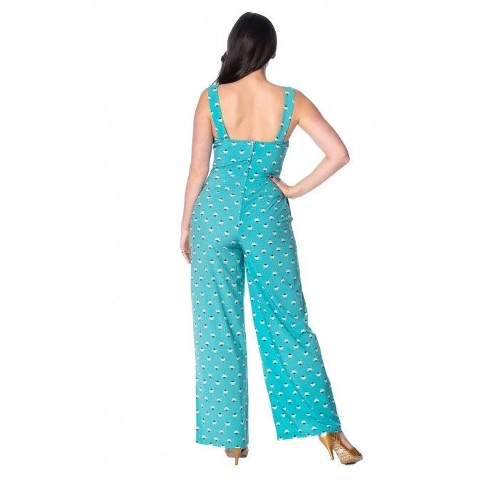 Get your playful out in this great retro-styled playsuit from Banned!!! The vintage one-piece garment has a pretty sweetheart neckline with fold-over detailing, a nipped-in waist, and wide legs. The wide straps are adjustable and button in the back, either straight or crossed. The fabric is luxuriously soft.  Zips up the back.