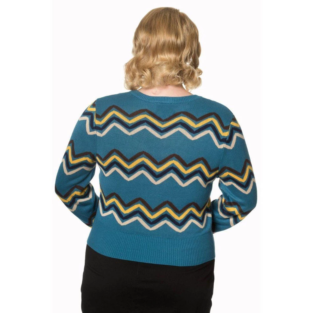 You’ll be “diggin’ those good vibrations” in this 60’s cropped cardi from Banned. This colorful sweater has a background in marine blue and features zig-zag stripes all the way around in brown, gold, navy, and white. The long-sleeved cardigan has a v-neckline with solid blue wide ribbing at the cuffs and hem, and narrow ribbing around the neckline and down the front. Buttons down the front.