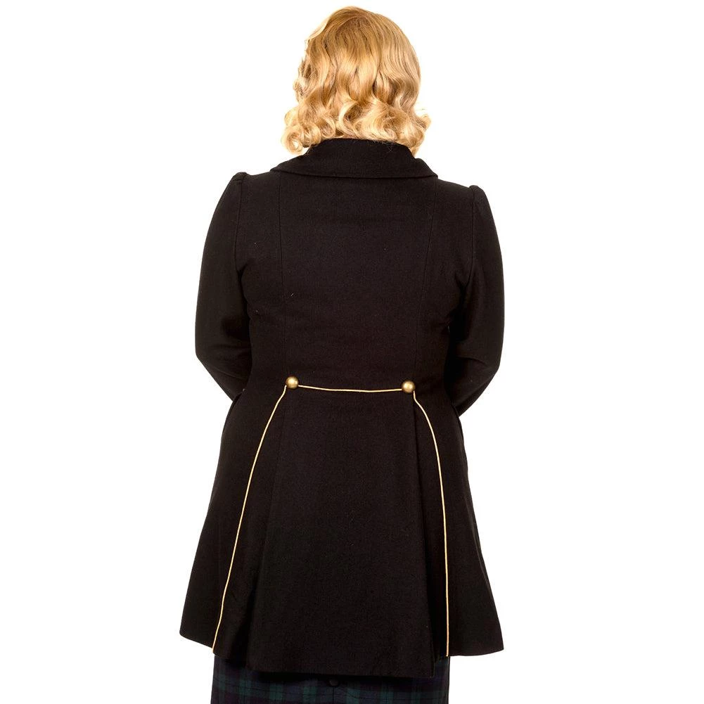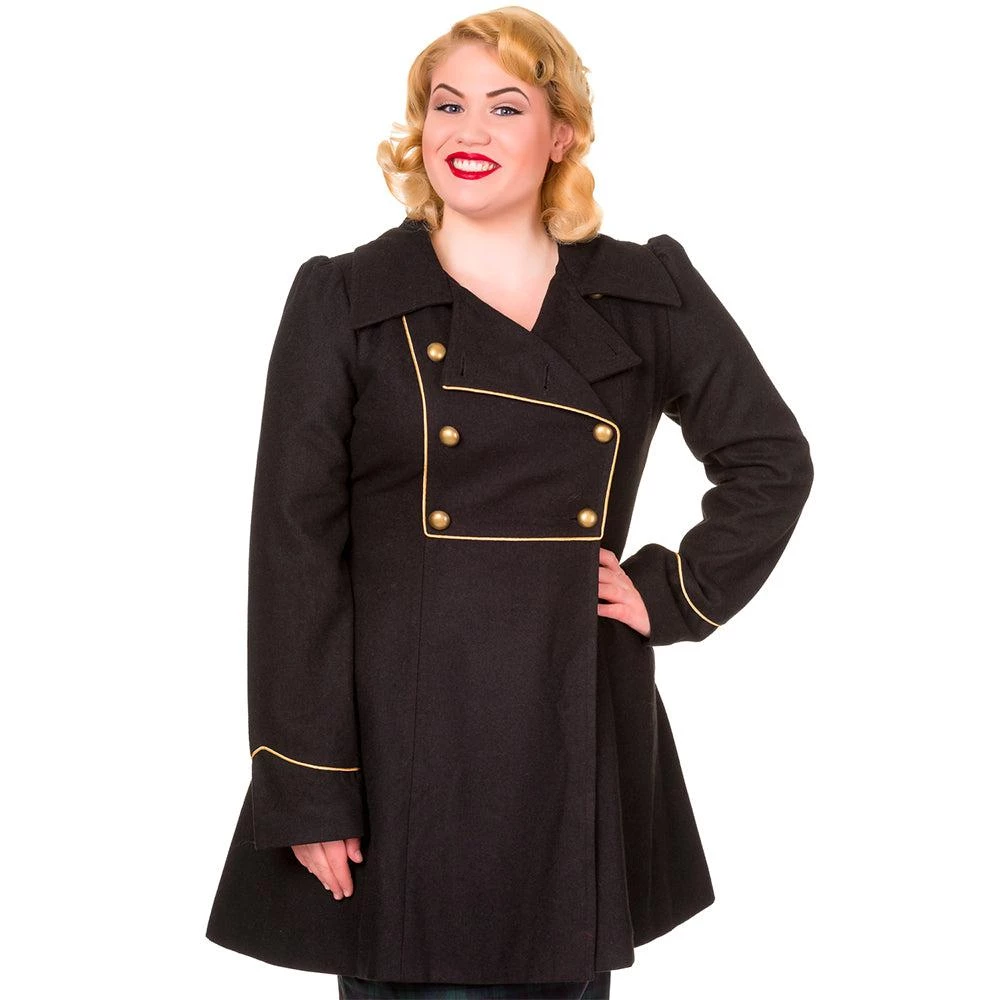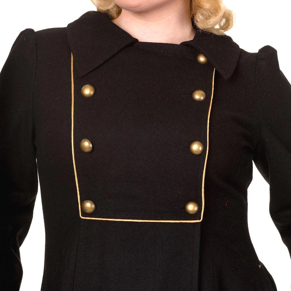 You’ll feel like beauty on parade in this gorgeous military coat from Banned. The crisp black coat has a squared front bodice accentuated by gold piping and two rows of gold buttons down the front. A double-breasted coat, it has invisible button fastenings inside, and can be worn buttoned up to the neckline or left with the top button open to form a v-neckline, finished with a crisp fold-over collar. Jaunty sleeves are slightly puffed at the shoulder and are finished with a military cuff piping. This fully lined coat has side seam pockets and a flared hem. Salute!!