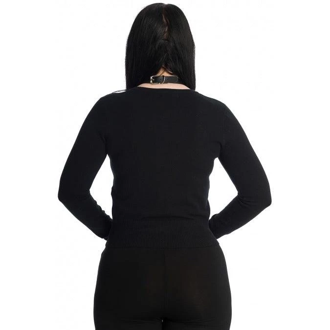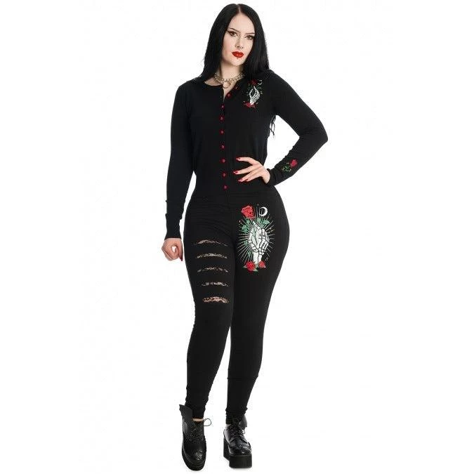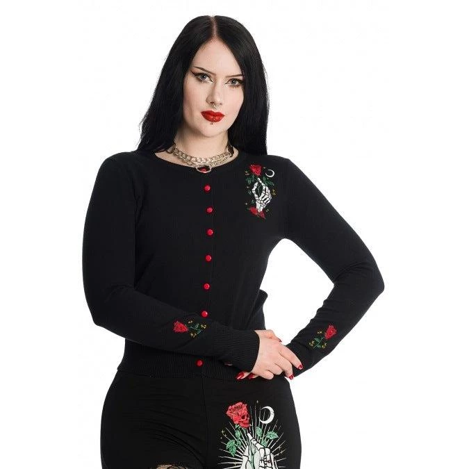 This gorgeous cardigan celebrates an ancient goddess of fertility and war, so make your boundaries clear in this beautiful piece. The solid black cardigan is embroidered on the sleeves with deadly roses, and the chest embroidery features a delicately skeletal hand holding a rose, surrounded by stars and, of course, a sliver moon above it all. The long-sleeved cardigan is ribbed at the waist, neckline, and cuffs, and it closes with bright red buttons down the front.