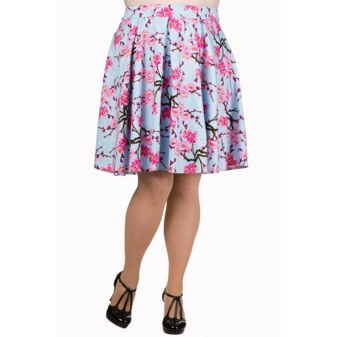 This beautifully printed skirt from Banned is as fresh as an orchard in spring! The swing skirt is made from a lovely brocaded sky blue fabric printed with peach branches blossoming in vibrant pink. Styled with pretty pleats for a generous fullness. The length is 22″ from the waist for a hem that falls above the knee. It zips up the back and closes with a hidden hook and eye. Â