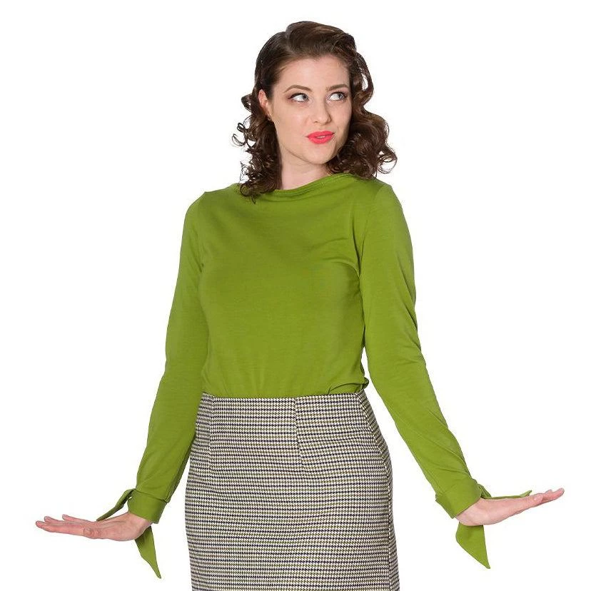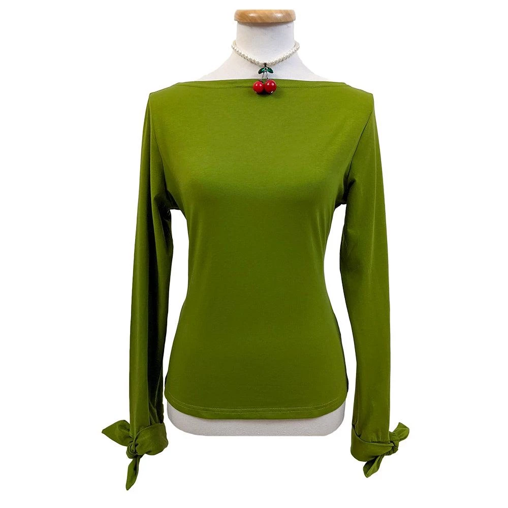 You’ll look just darling in this bow top from Banned! This long-sleeved knit tee has a gentle boatneck and two bow ties at the cuffs.Â
