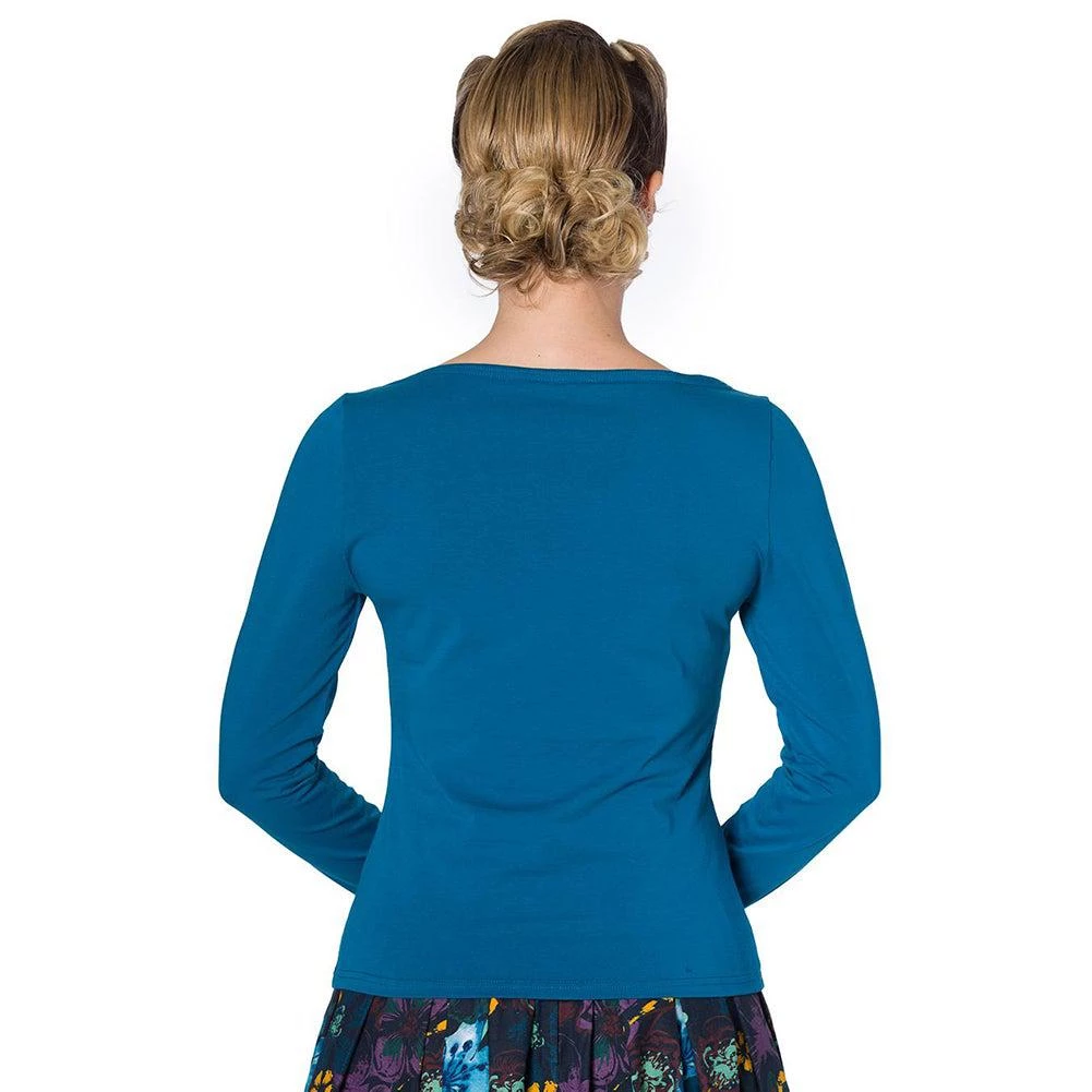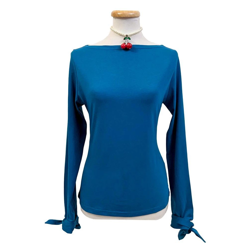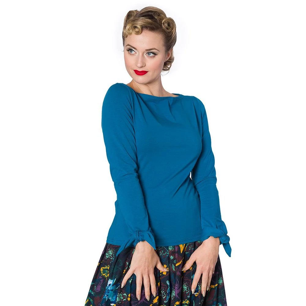 You’ll look just darling in this bow top from Banned! This long-sleeved knit tee has a gentle boatneck and two bow ties at the cuffs.