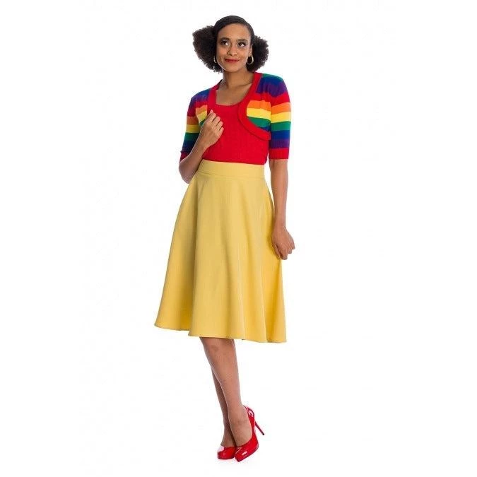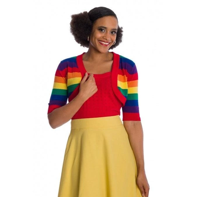 This rainbow striped bolero is a pot of gold for your wardrobe! Cute and cropped, you can wear it with nearly anything to put a bit of “wow” on top. Ribbed in red around the edges and at the bottom of the elbow-length sleeves, it has a an incredibly flattering fit.