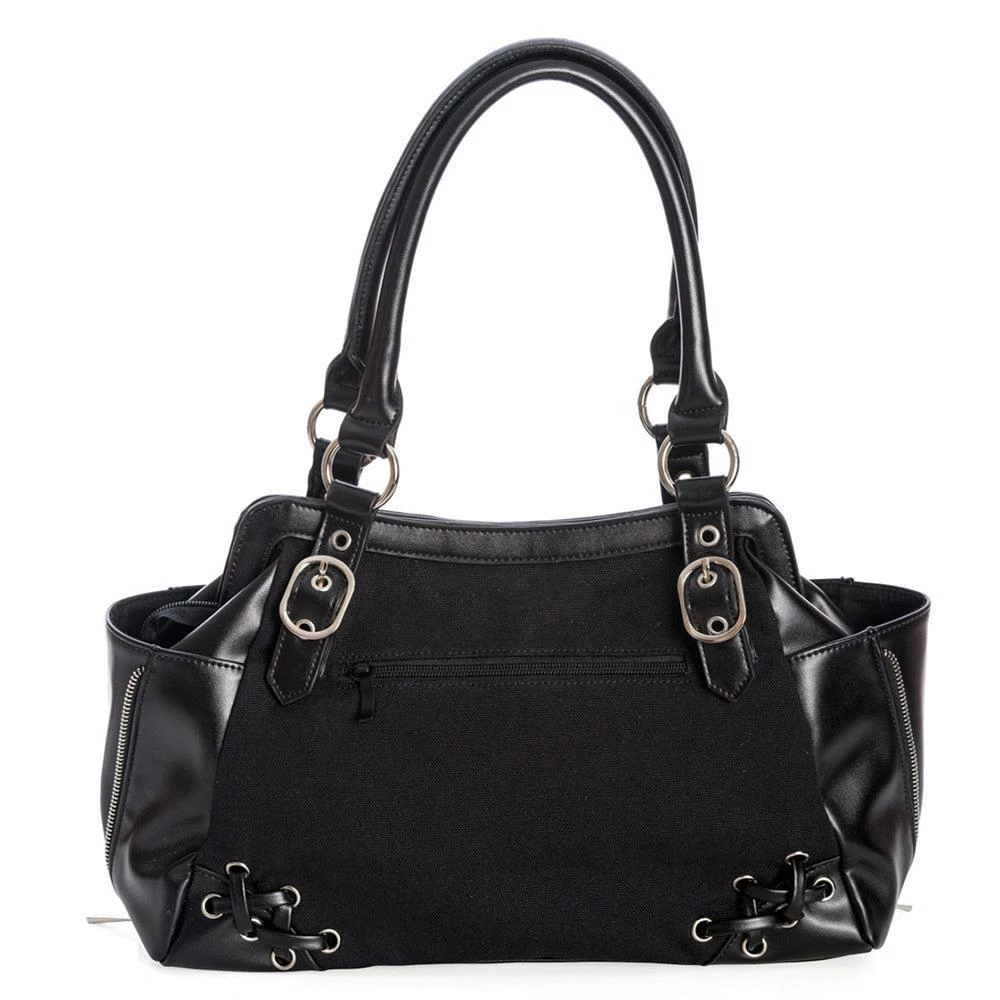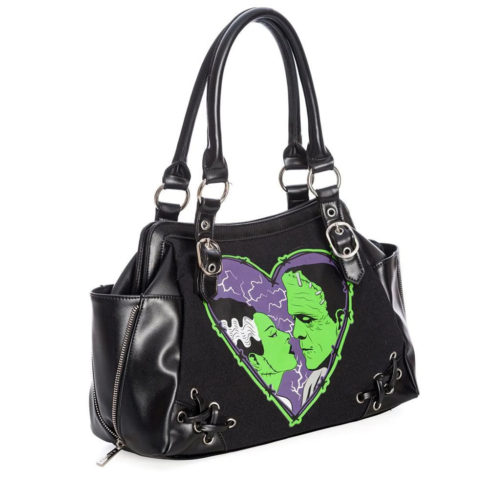 Show your love for the classic horror power couple with this TERRORific new purse from Banned! This handbag features an applique of the Monster and his Bride when sparks are flying, plus some stitched details on the front and back to help you feel like part of the fun. Two large exterior pockets keep your necessities close at hand. Large center pocket, fully lined.