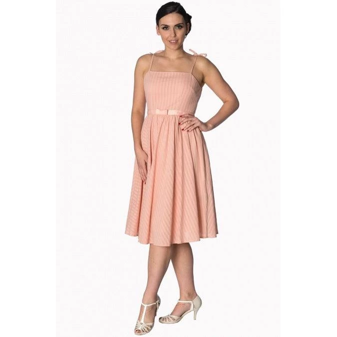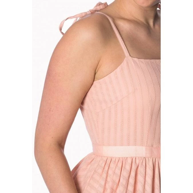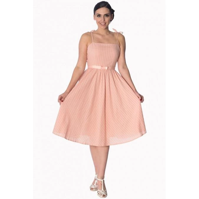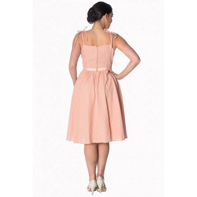 This sweet sundress from Banned is a wish come true! Light and breezy, it is made from cotton woven in subtle stripes. The fitted bodice has spaghetti straps that tie on the shoulders. It has a full gathered swing skirt and the waist is accented with a band of pink grosgrain ribbon with a flat bow center front. Fully lined and zips up the back. Pretty as a summer day!
