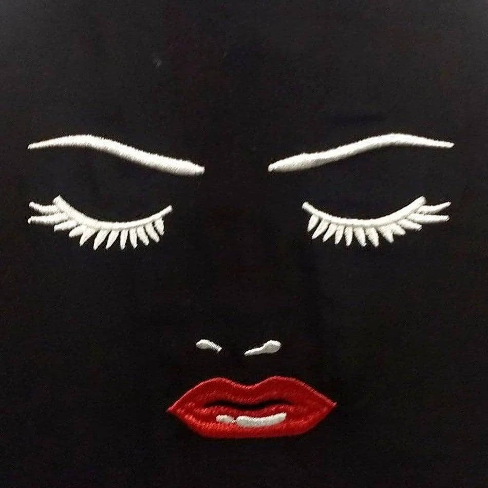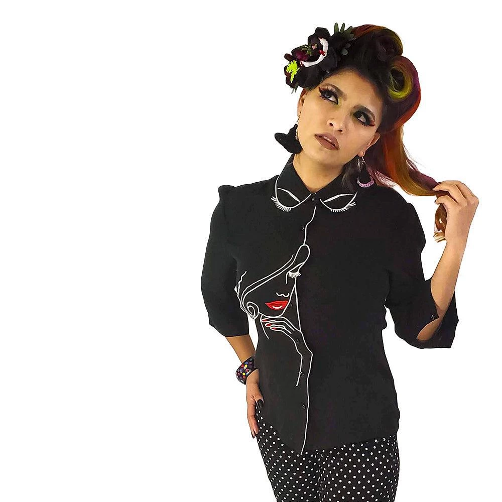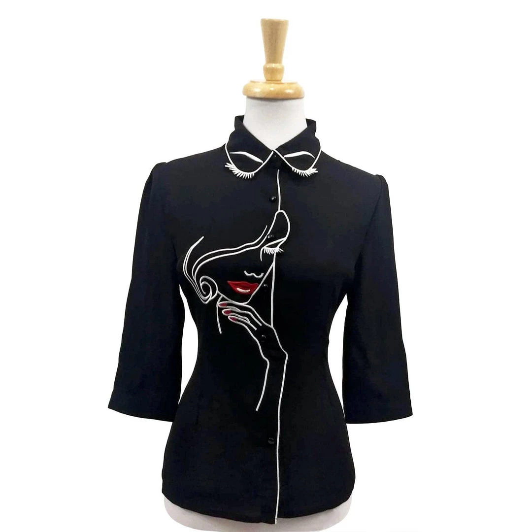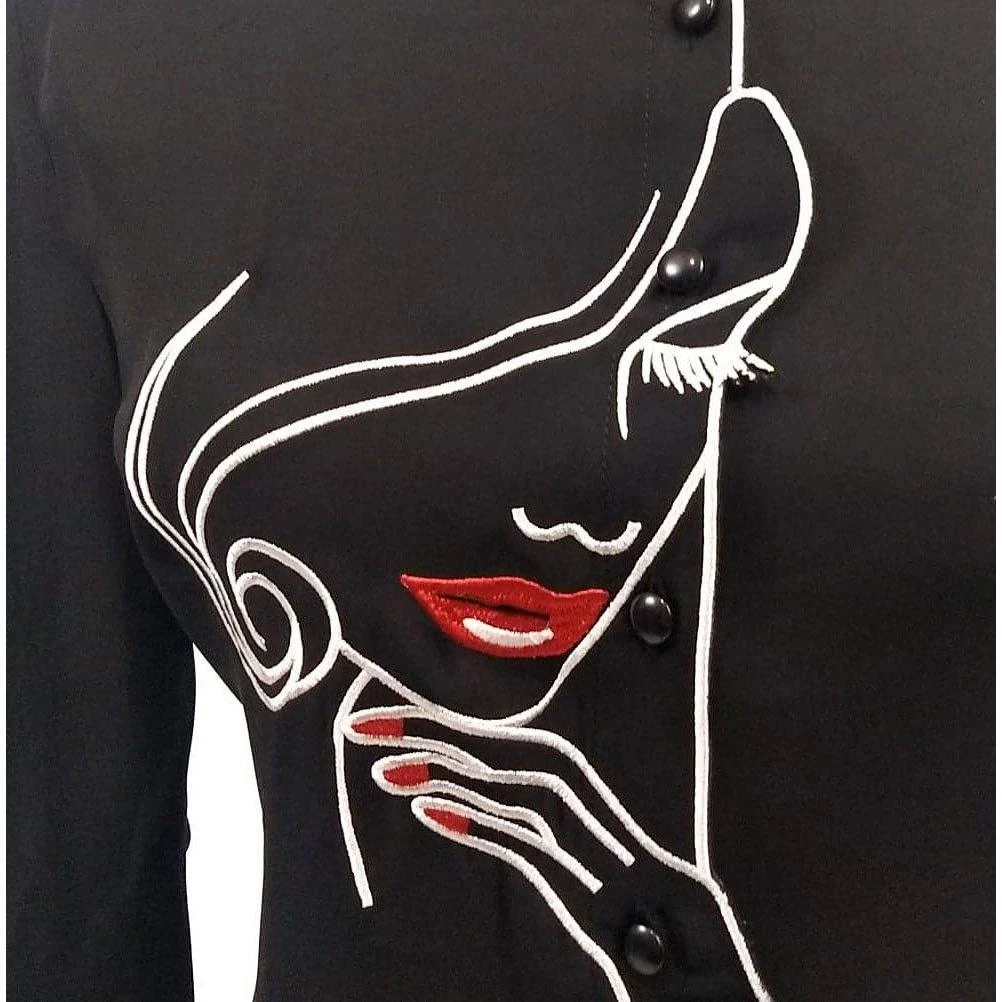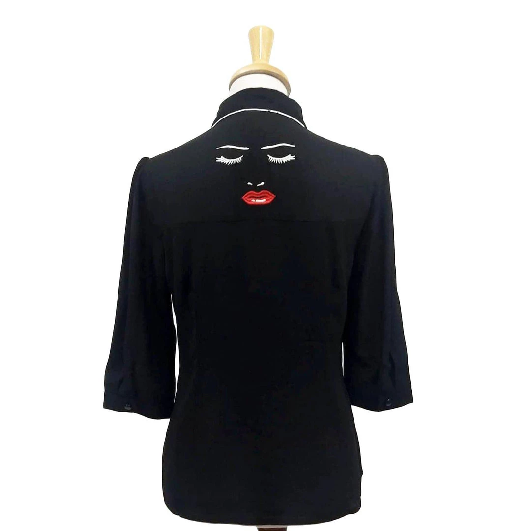 Soft black blouse has an eye-catching design of a “pretty woman” on the front and an enchanting set of facial features on the back. The lipstick and nail varnish are deep red, and everything else, including the fabulous eyelashes, are embroidered in white.  The shirt has a high neckline with fold over collar, 3/4 length sleeves that button at the cuff, and it buttons up the front.