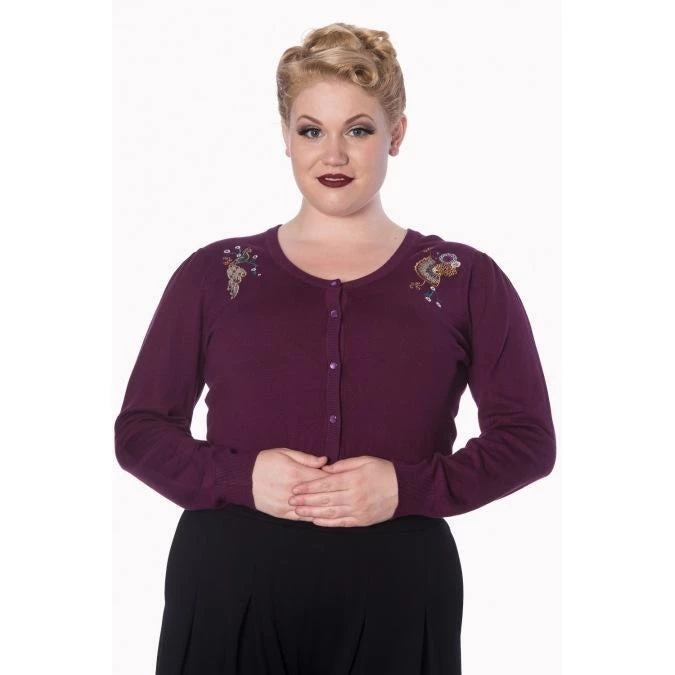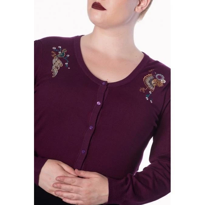 You can wear this gorgeous cardigan from Banned with the pride of a peacock!! The beautiful embroidery will draw attention to the stately peacock on one side, and a feathered fan on the other. Soft and comfy, this cardigan is long sleeved with a round neckline. It is ribbed at the neck, hem, and sleeve cuffs, and it buttons up the front with shiny matching buttons.