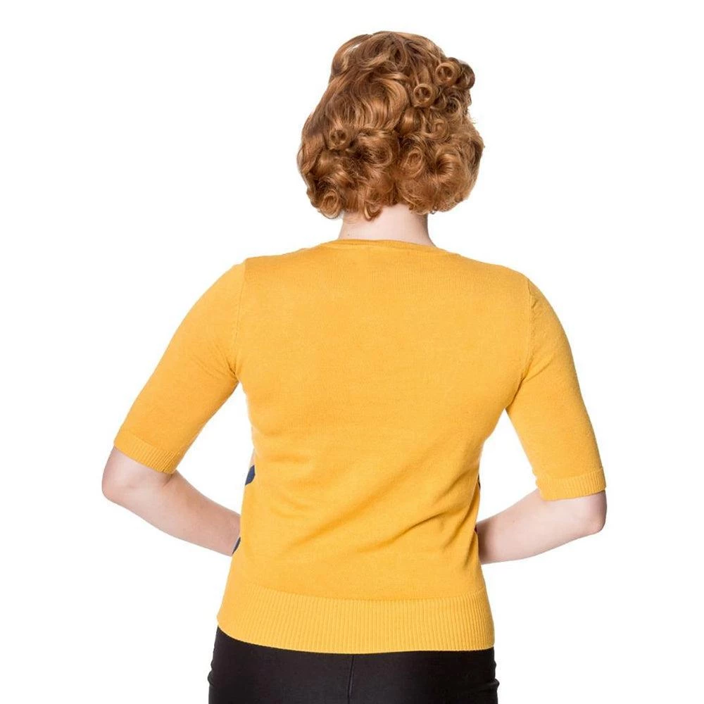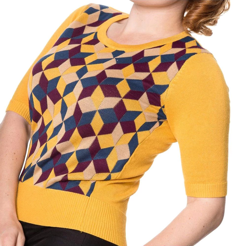 Bring a fun geometric beat to your outfit with this distinctive retro cube pullover sweater! This playful 50s inspired jersey top features short sleeves and a classic scoop neckline, with cuffed hems for a stable and sure finish. Scoop neckline, elbow-length sleeves, finished with a soft ribbed binding for comfort.