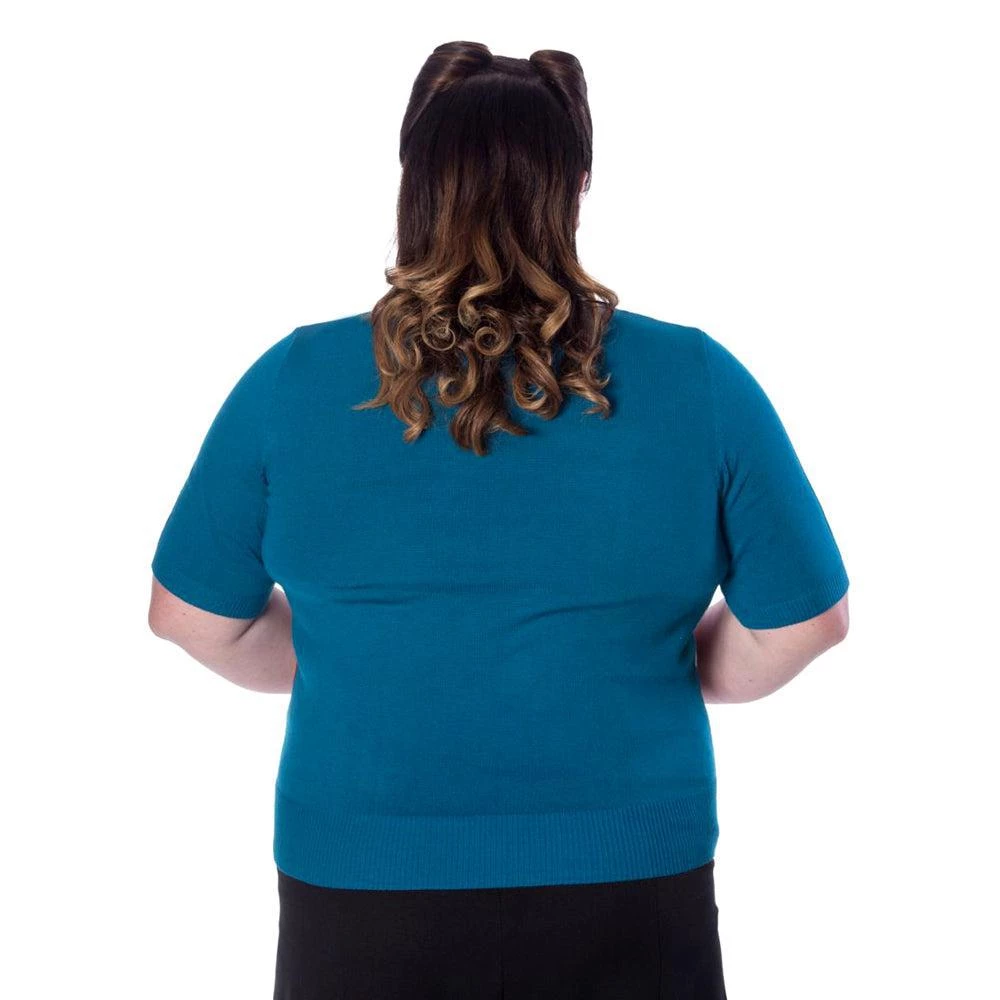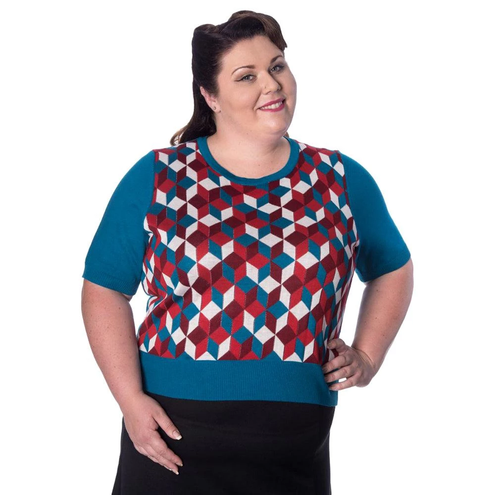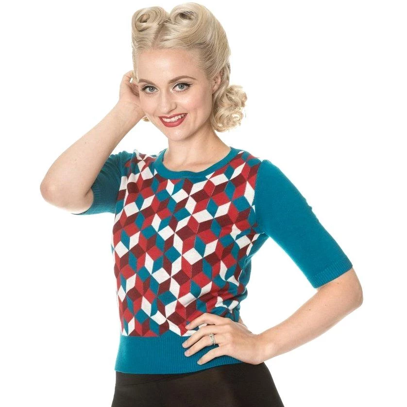 Bring a fun geometric beat to your outfit with this distinctive retro cube pullover sweater! This playful 50s inspired jersey top features short sleeves and a classic scoop neckline, with cuffed hems for a stable and sure finish. Crafted in a delightful turquoise background with burgundy, red, and cream detailing, this cute top will be easy to match. Scoop neckline, elbow-length sleeves, finished with a soft ribbed binding for comfort.