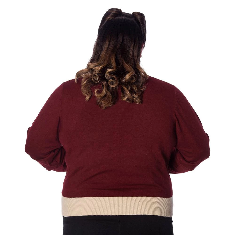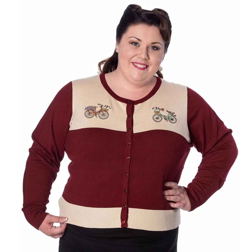 Get ready to ride in this sweet two-toned cardigan from Banned. This soft and stretchy long-sleeved crewneck cardigan is colorblocked in burgundy & tan, and features vintage-inspired embroidery of bicycles & flowers on the chest.