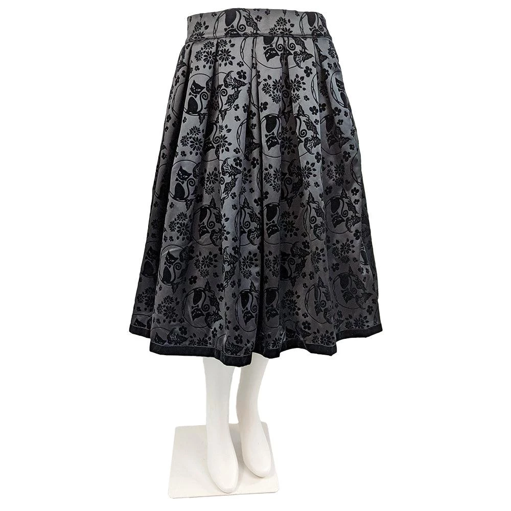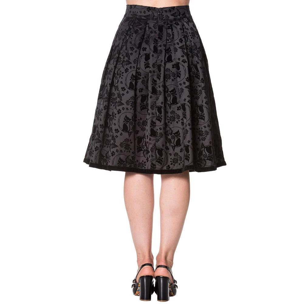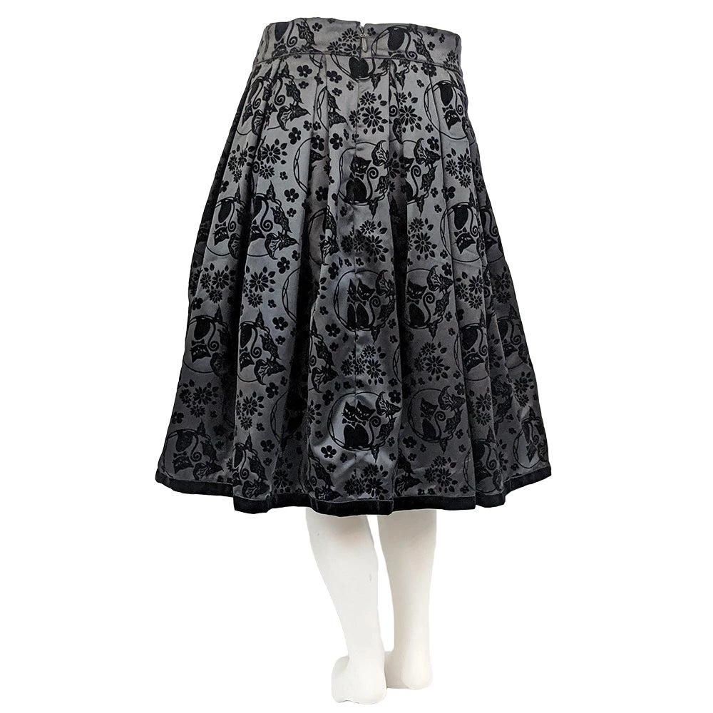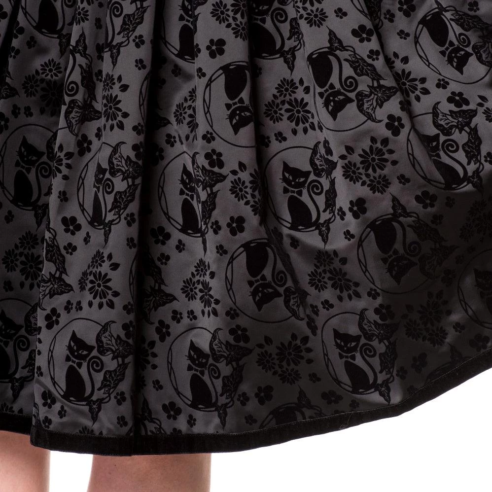 What a pretty kitty! The Sia Bella skirt from Banned features their beautiful print of a clever kitty with flowers and vines in velvety black flocking on a black background. The swing skirt is styled with a wide waistband and box pleats. It has side seam pockets and zips up the back. The hem is a narrow band of black velvet.