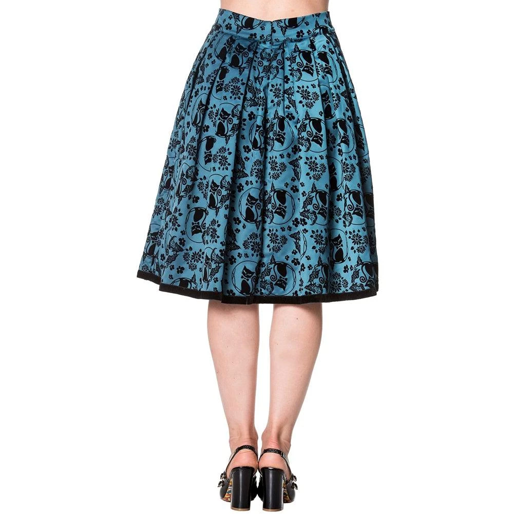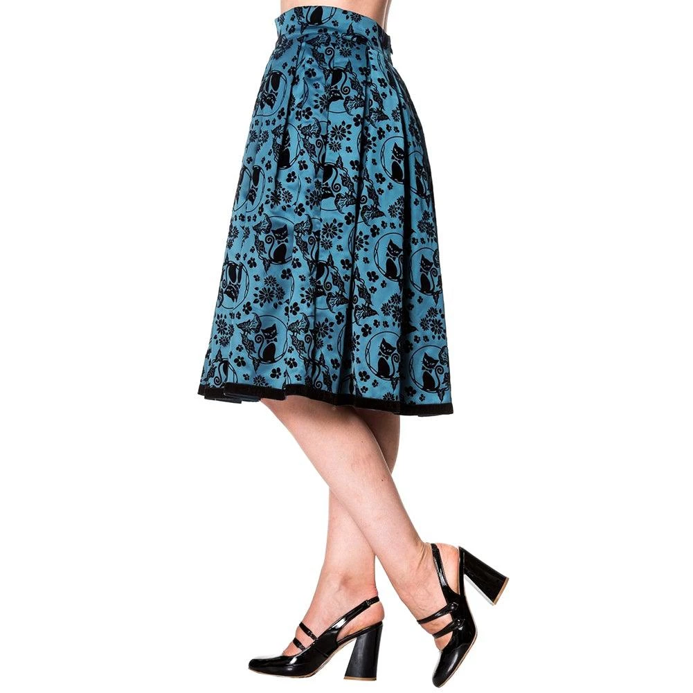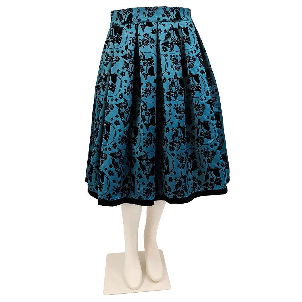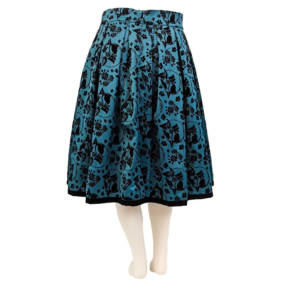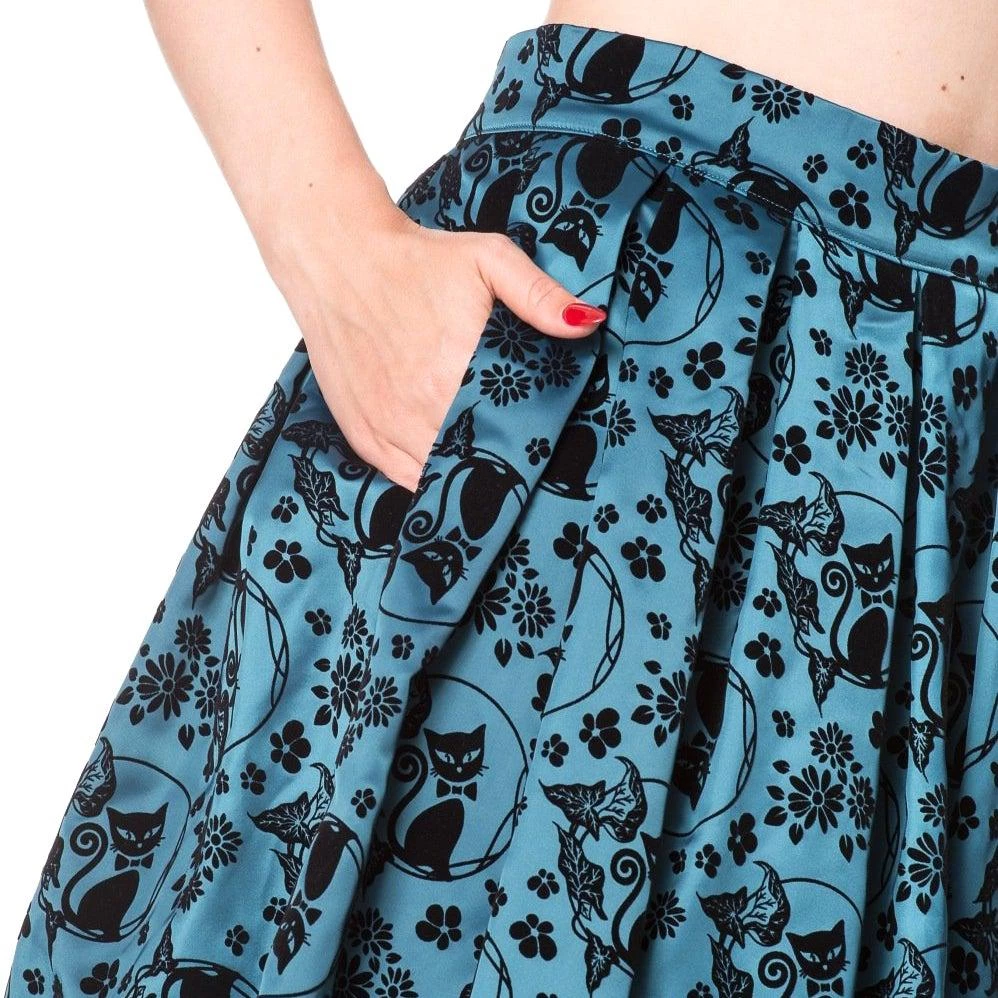 What a pretty kitty! The Sia Bella skirt from Banned features their beautiful print of a clever kitty with flowers and vines in velvety black flocking on a teal background. The swing skirt is styled with a wide waist band and box pleats. It has side seam pockets and zips up the back. The hem is a narrow band of black velvet.