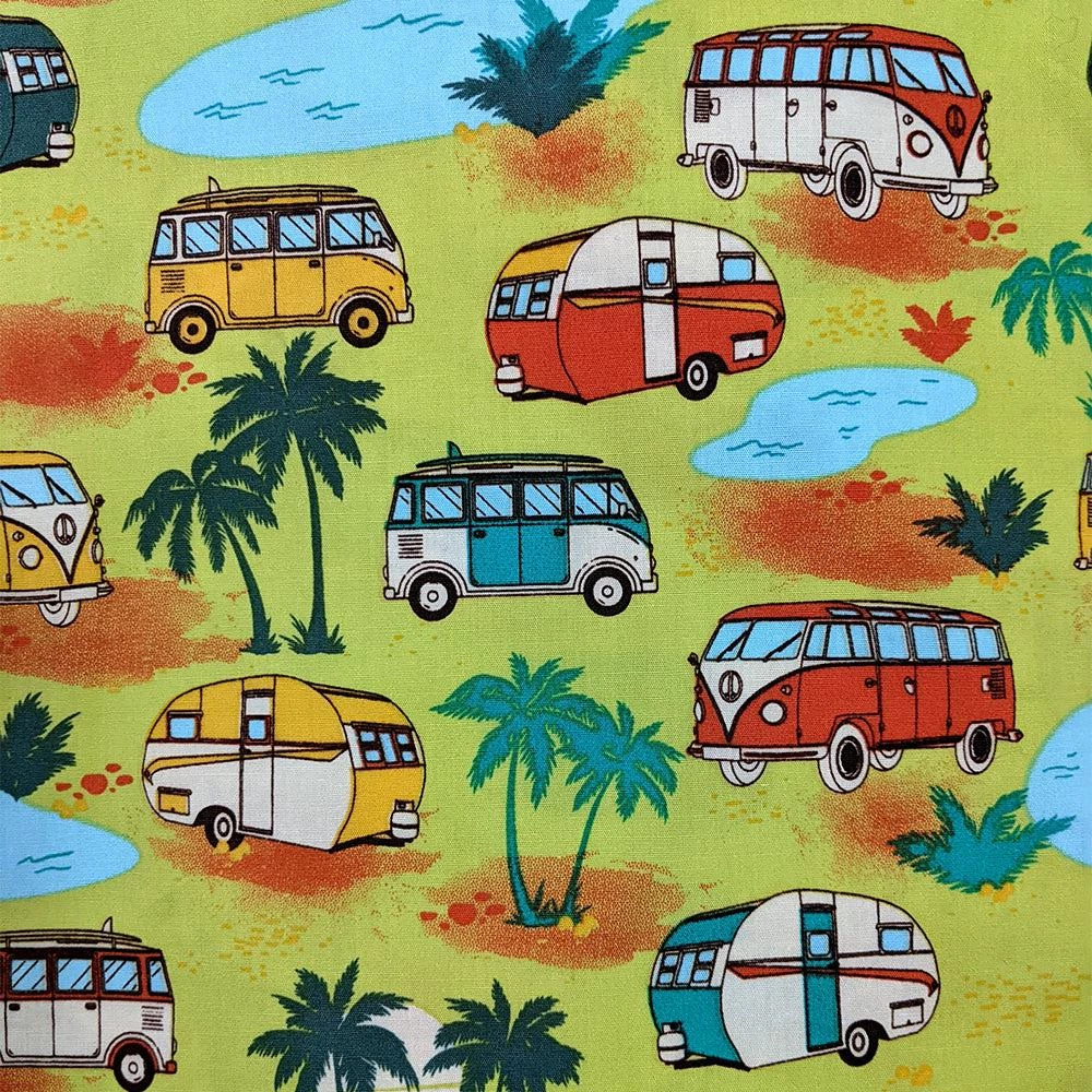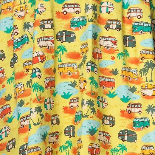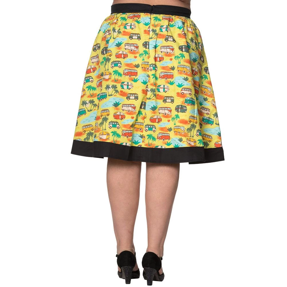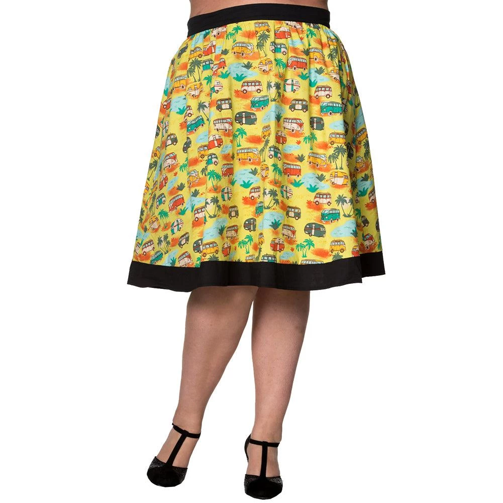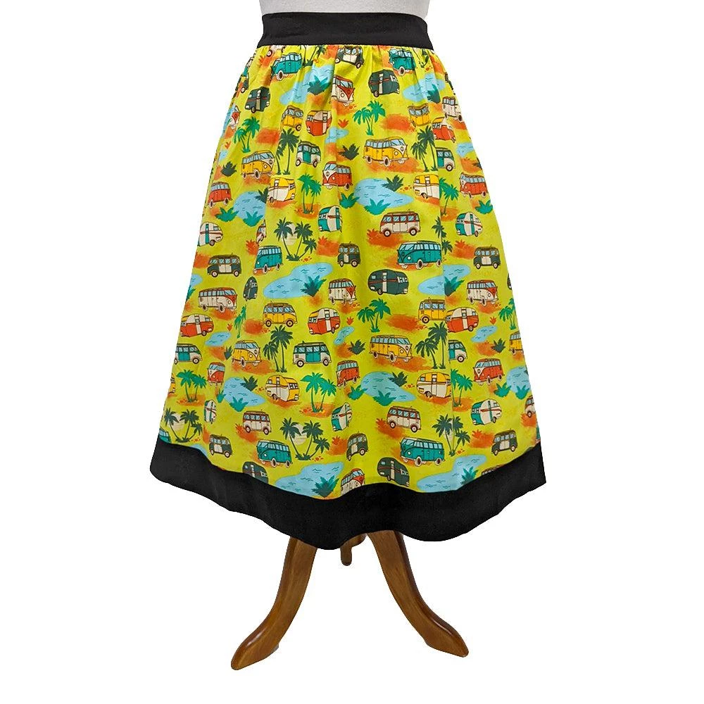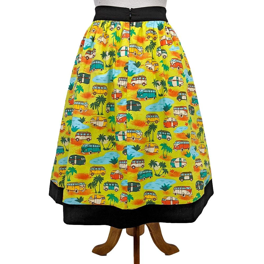 This fun gathered skirt from Banned features an epic print of retro campers amidst palm trees and pools, all on a chartreuse background. The fan-favorite fabric design is set off by black contrast bands at the waist and hem of skirt.