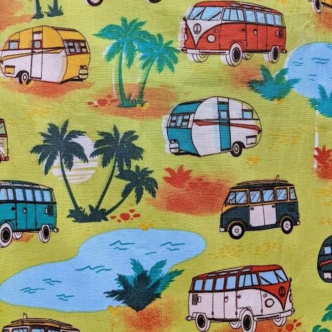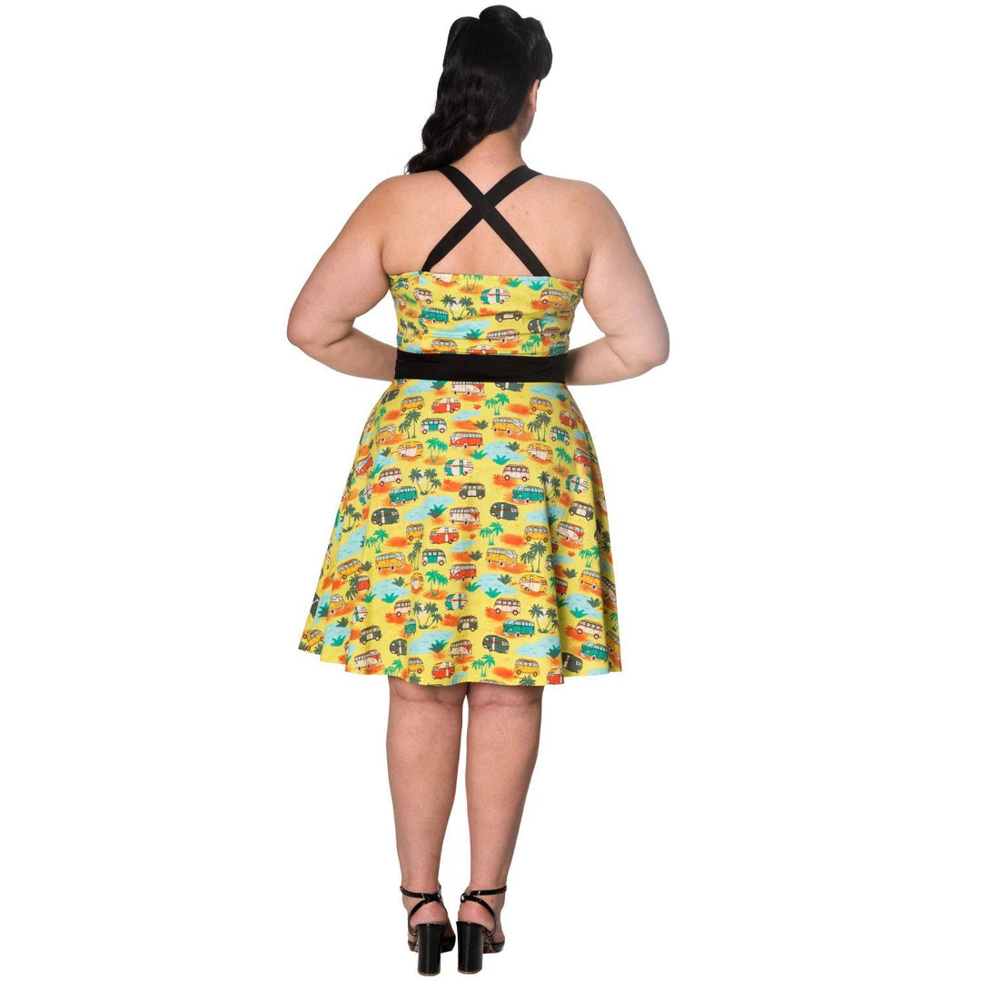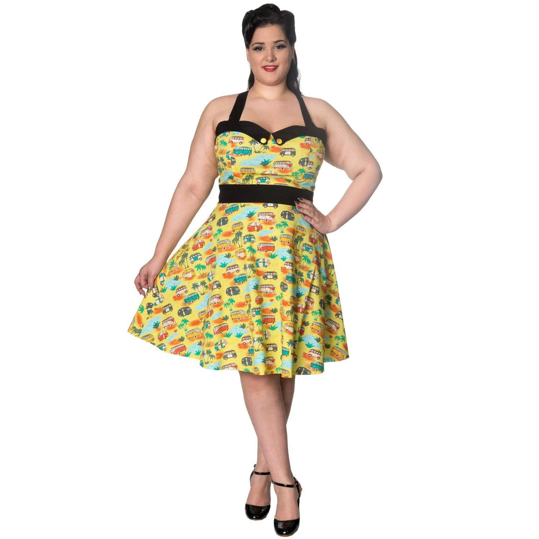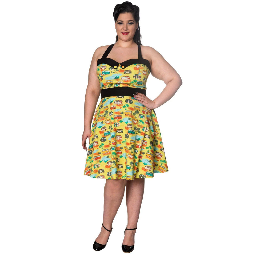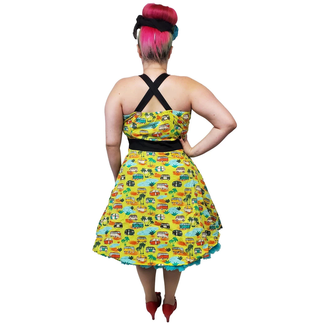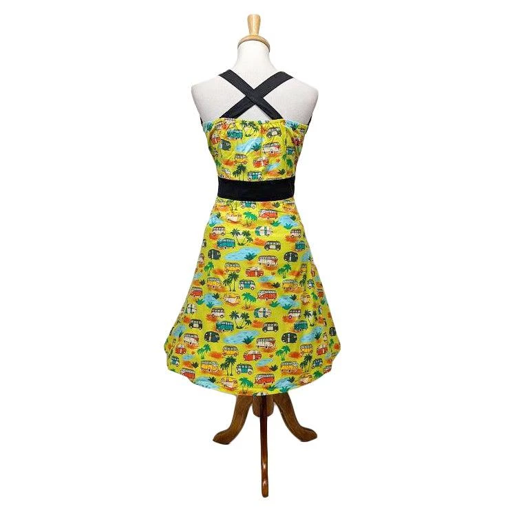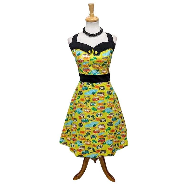 This fabulous dress features an epic print of retro campers amidst palm trees and pools, all on a chartreuse background. It has halter straps that button in the back, a sweetheart neckline, and a nicely flared skirt. Nicely detailed in black at the bust and the waistline. It has a cinched back for a perfect fit and zips up the side.