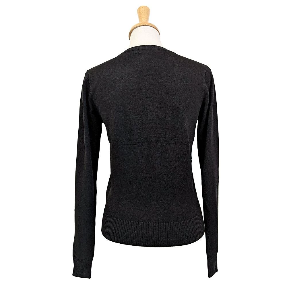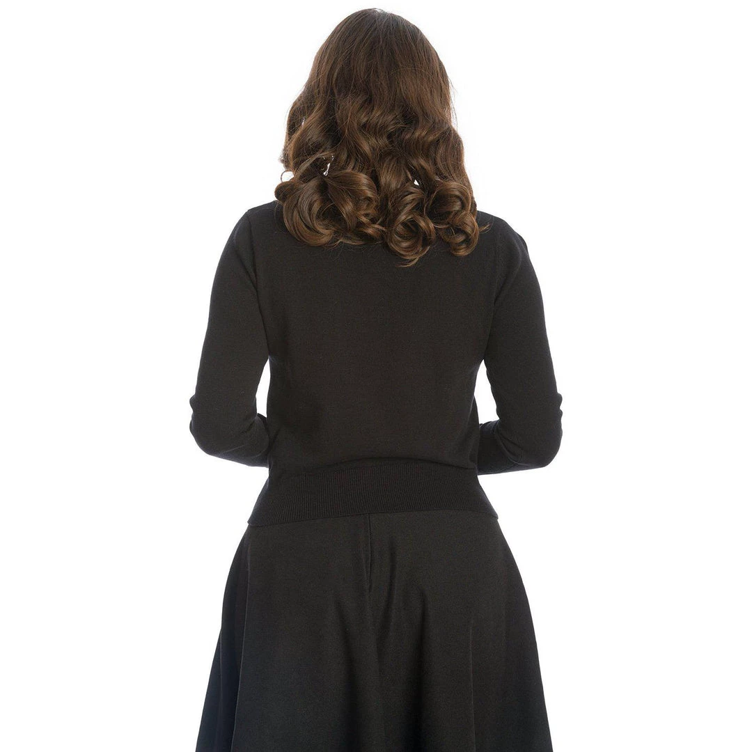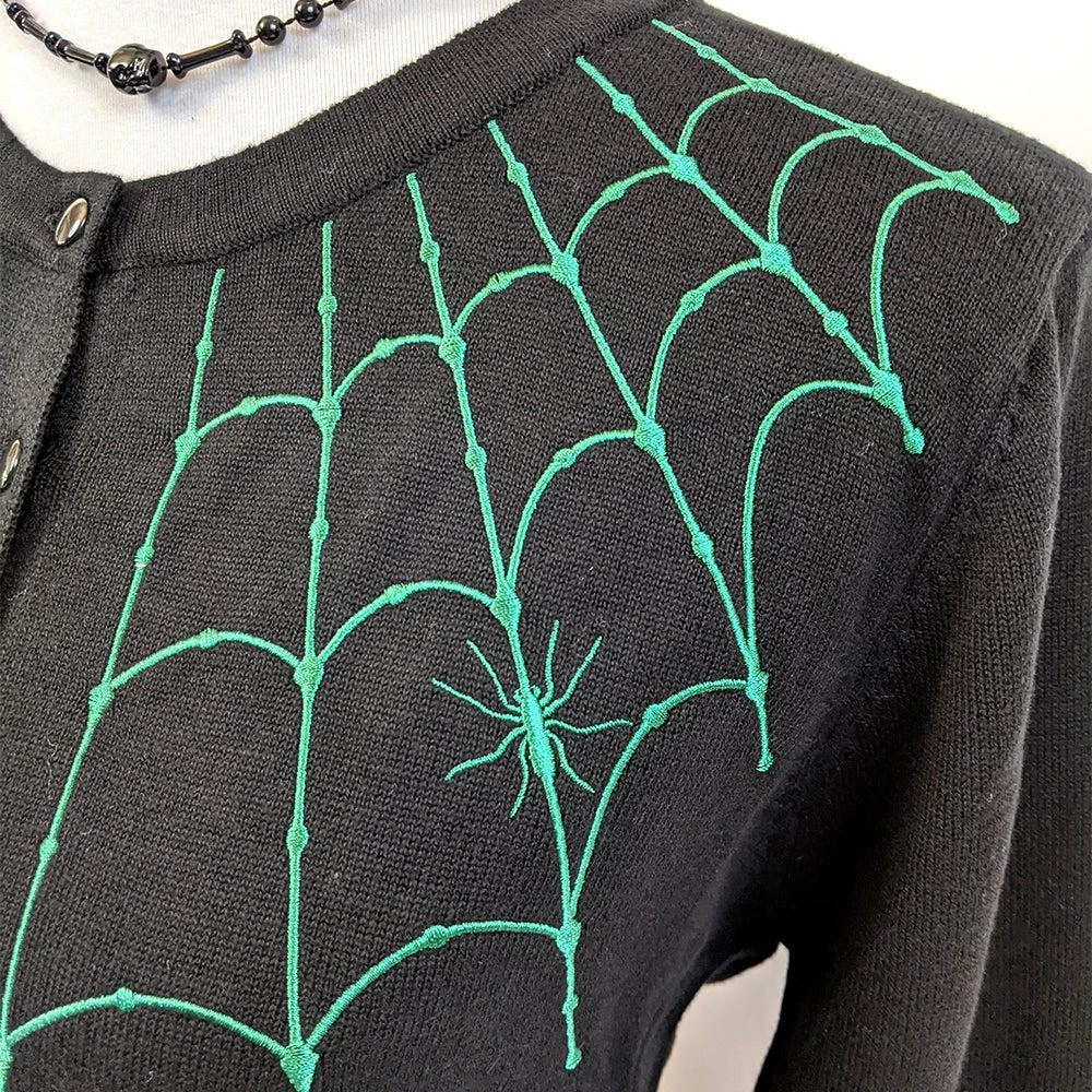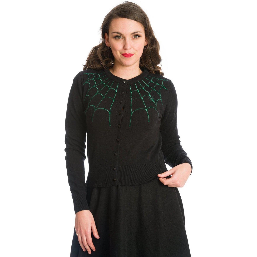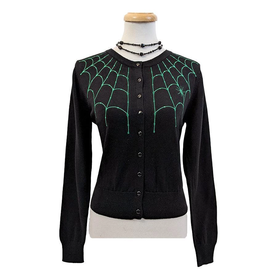 Fabulously spooky, this wickedly webbed black cardigan from Banned will be your favorite “every day is Halloween” sweater. Made with the quality Banned is known for, it features black buttons and a green embroidered spider web chest design on black knit. It has long sleeves, a round neckline, a figure accentuating fit, and ribbed cuffs and hem.