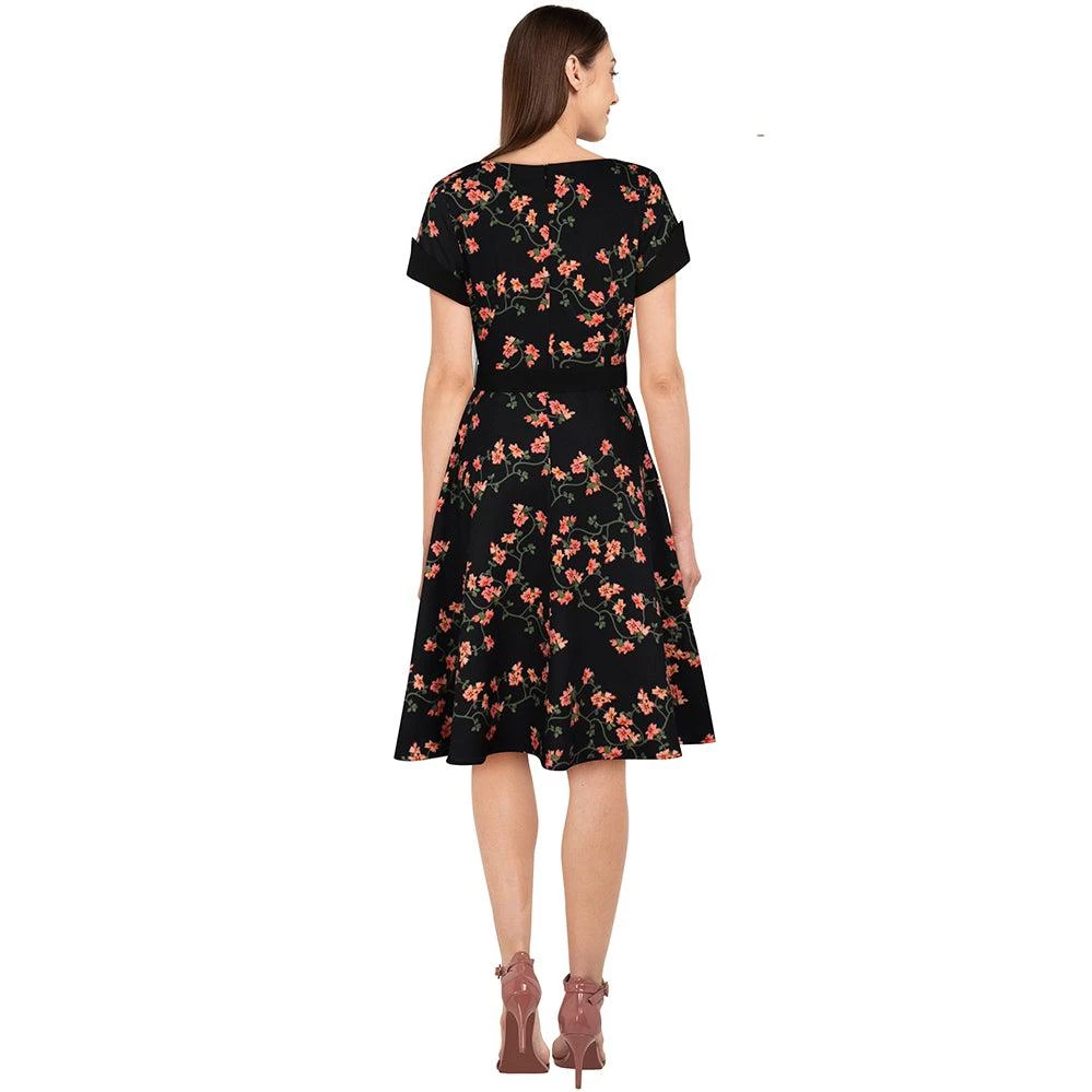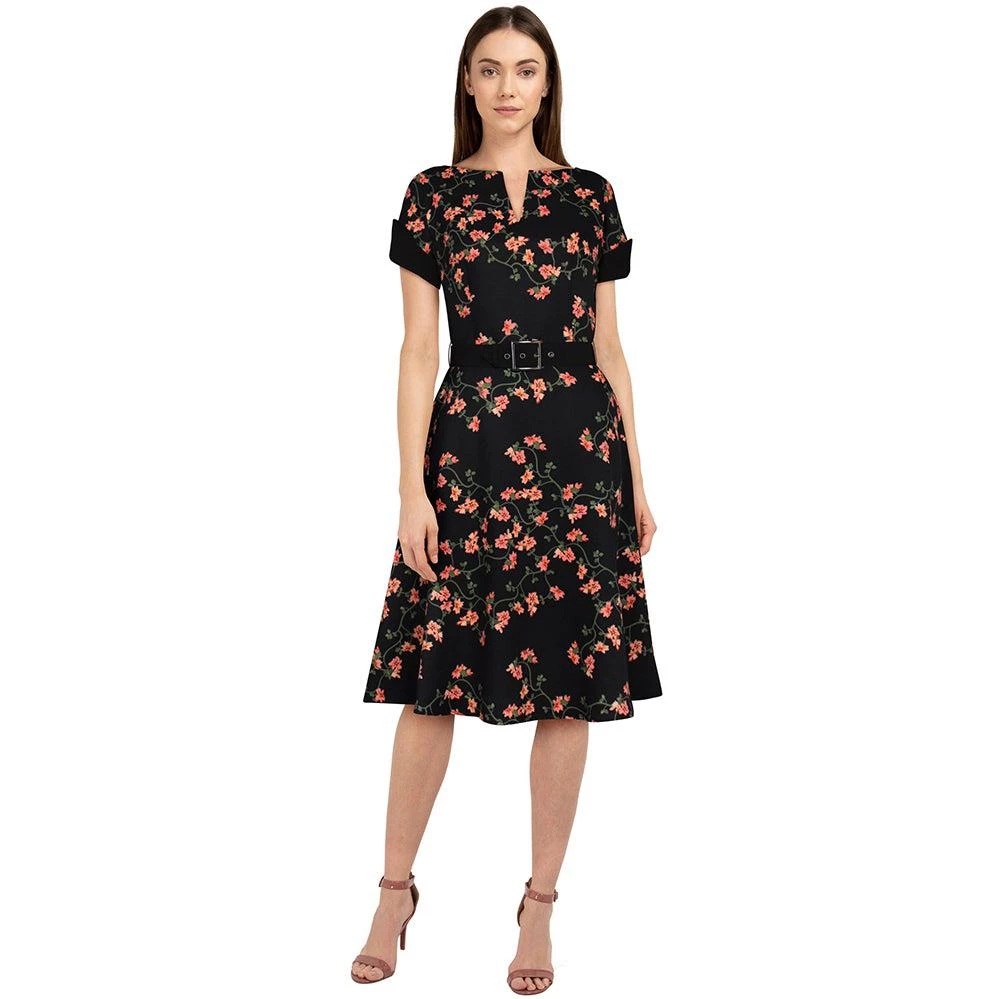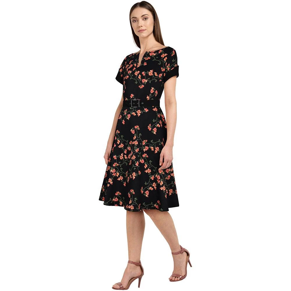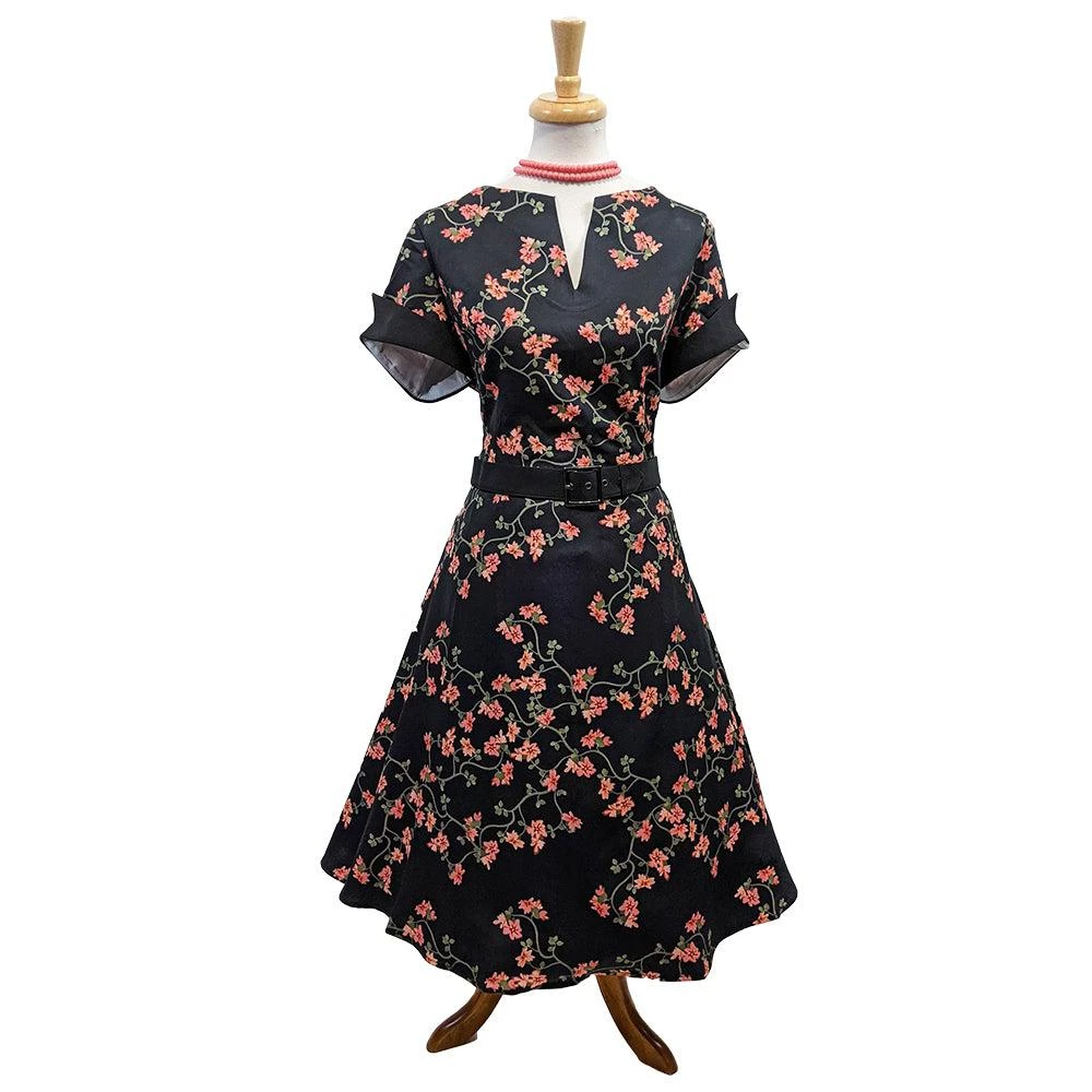 Craving 40’s style but modern comfort? Check out this buttery-soft floral swing dress with an eye-catching split V-neck, and cuffed short sleeves for a bit of structure. The bodice is darted at the bust and down to the waist, which drapes into a flowy swing skirt. Rear zip.Â