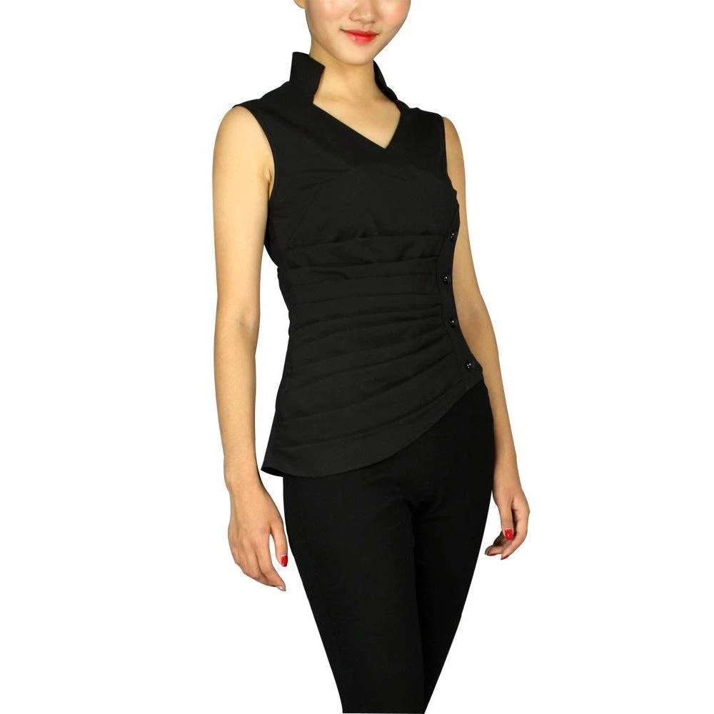 Make a splash in this eye-catching asymmetrical pleated top, with a wrap neckline topped off by a stand up collar, off-center functional buttons, flattering pleats and ruching in the torso, all set off nicely by the scooped hem.